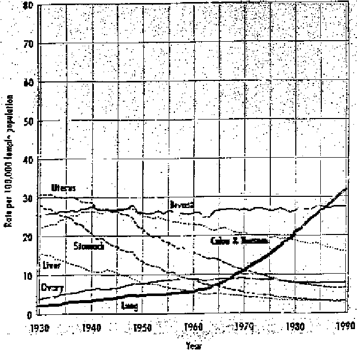 De cijfers voor de vrouwen in dezelfde leeftijdsgroep zijn minder ernstig, maar, zoals uit de evolutie over de verschillende jaren blijkt, heeft dit alleen te maken met het feit dat de vrouwen bij ons pas in de jaren vijftig en zestig massaal zijn beginnen roken.