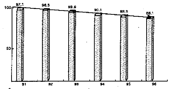 Ten tweede dat het percentage rokers opnieuw stijgt, wanneer er onvoldoende inspanningen worden geleverd : het percentage rokers bij volwassenen is terug gestegen van 25 % in 1993 tot 30 % in 1996.