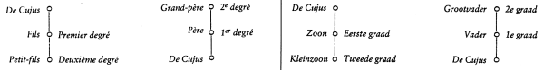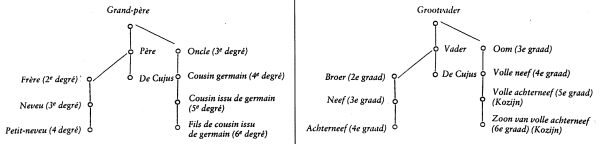 En ligne collatérale, les degrés se comptent suivant les générations, de l'un des parents jusqu'à l'auteur commun non compris, et de celui-ci jusqu'à l'autre parent (article 738). Ainsi deux frères sont au deuxième degré; l'oncle et le neveu sont au troisième degré; les cousins germains au quatrième, les cousins issus de germains au cinquième et ainsi de suite.