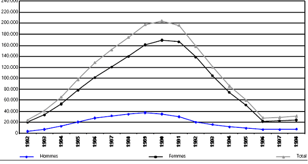 Évolution du statut de temps partiel involontaire/temps partiel avec maintien des droits selon le sexe 1982-1998