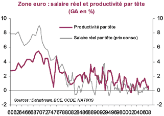Dat is het gevolg van de stagnering van de inkomsten van de huishoudens. De grafiek hieronder toont aan dat de werkelijke salarissen sedert 1970 in de landen van de eurozone gemiddeld langzamer zijn gestegen dan de productiviteitswinsten. Huishoudens verdienen niet genoeg meer om de producten te kopen die zij produceren, en bouwen de schulden op om hun levensstijl te behouden.