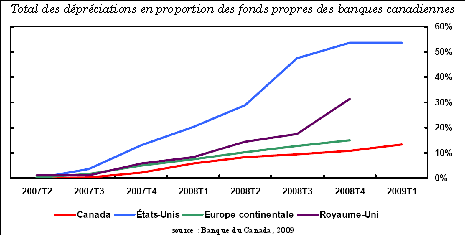 De waardeverminderingen van de activa die de Canadese banken tot nu toe hebben doorgevoerd — de voornaamste bron van financiering in onze economie — waren veeleer beperkt, wat klopt met hun strikte praktijken inzake lenen en hun geringe blootstelling aan instrumenten met sterk in waarde verminderde activa.