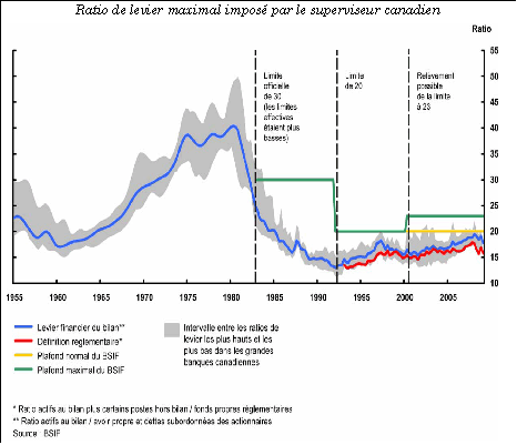 Typisch voor de Canadese banksector is dat de Canadese eisen voor eigen middelen verder gaan dan Basel II. Ook de hang naar risico van de Canadese banken lijkt beperkt, aangezien zij aanzienlijk meer eigen middelen aanhouden dan de supervisor vraagt. Bovendien is de effectisering van door de banken verleende hypotheekleningen er beperkter en behouden de banken een deel van de risico's in hun balans. Ten slotte leggen ook de banktoezichthouders de banken een maximale hefboomratio op. Dat laatste is ongetwijfeld de grootste garantie voor de stabiliteit van de Canadese banken.
