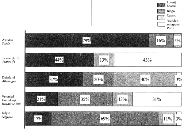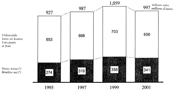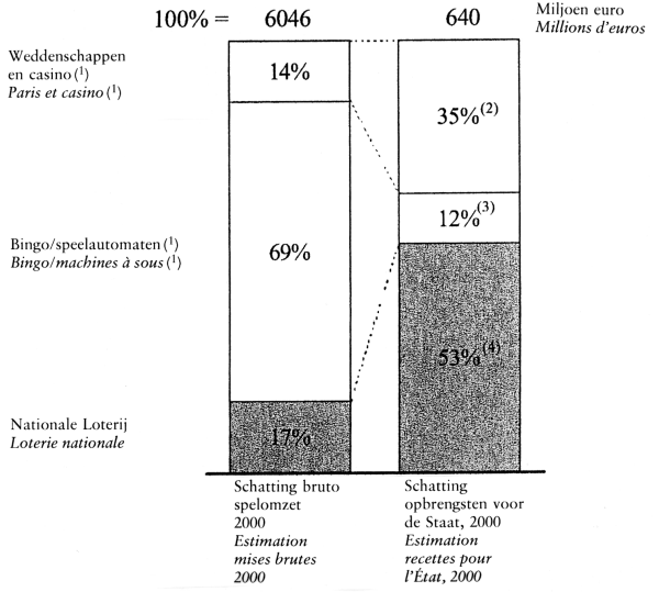 Bien qu'en 2000, la Loterie nationale n'ait réalisé que 17 % du chiffre d'affaires brut dans le secteur, le produit a été de 53 % pour les pouvoirs publics. Les appareils automatiques de jeux de hasard, qui représentent près de 70 % du marché, ne génèrent que 12 % des recettes des pouvoirs publics.