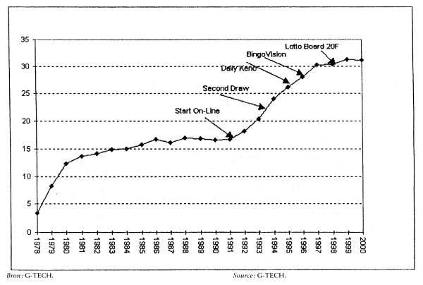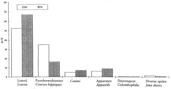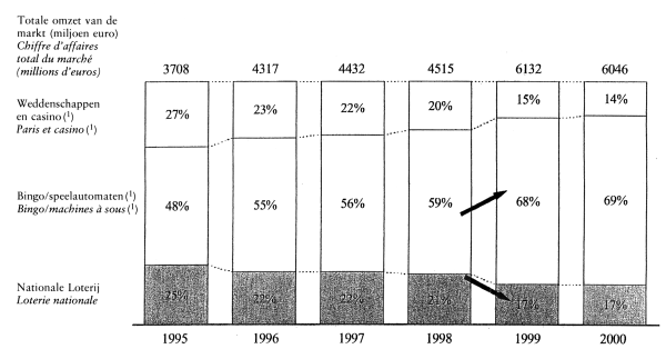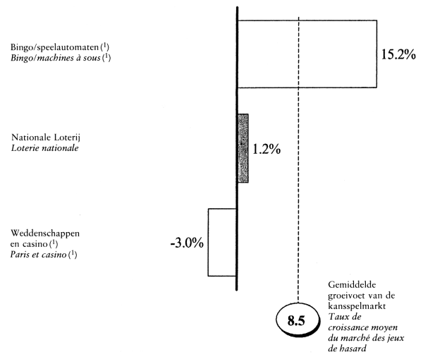 Commentant ces graphiques, le ministre attire l'attention sur un certain nombre d'évolutions remarquables qui se sont présentées depuis l'entrée en vigueur de la loi sur les jeux de hasard, en 1999. Depuis lors, la part de marché de la Loterie nationale est à la baisse, tandis que le marché des jeux de hasard a connu une croissance substantielle. La part de marché de la Loterie nationale, qui était de 25 % en 1995, est tombée à 17 % en 2000, alors que celle du secteur des machines à sous passait de 48 % en 1995 à 69 % en 2000. Le chiffre d'affaires total du marché des jeux de hasard a augmenté d'environ 4,5 milliards d'euros à plus ou moins 6,1 milliards d'euros. Cette augmentation est entièrement imputable au bingo et aux machines à sous, et non, par conséquent, à la Loterie nationale ou aux paris et aux casinos.