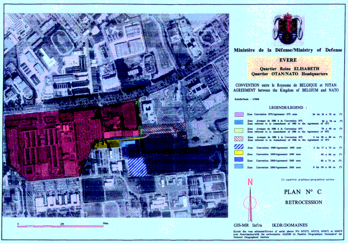 c. Les terrains d'une superficie de 9ha 80ca, concédés par l'accord signé à Bruxelles le 5 octobre 2000 entre le Royaume de la Belgique et l'Organisation du Traité de l'Atlantique Nord, seront rétrocédés par l'Organisation au Gouvernement du Royaume de Belgique à concurrence de 80a 83ca (repris sous liseré jaune au plan en annexe C à la présente Convention) sans aucune indemnité.