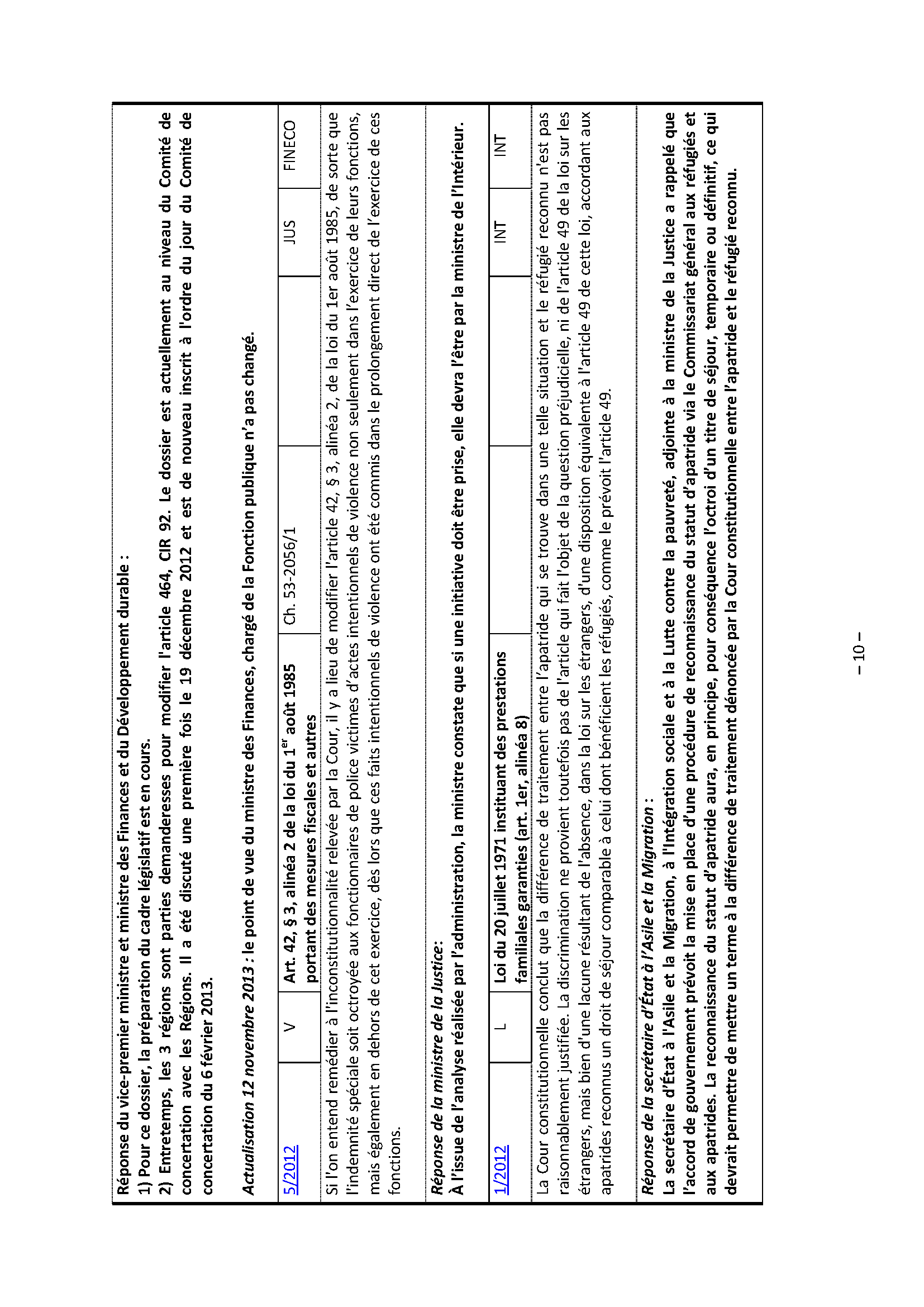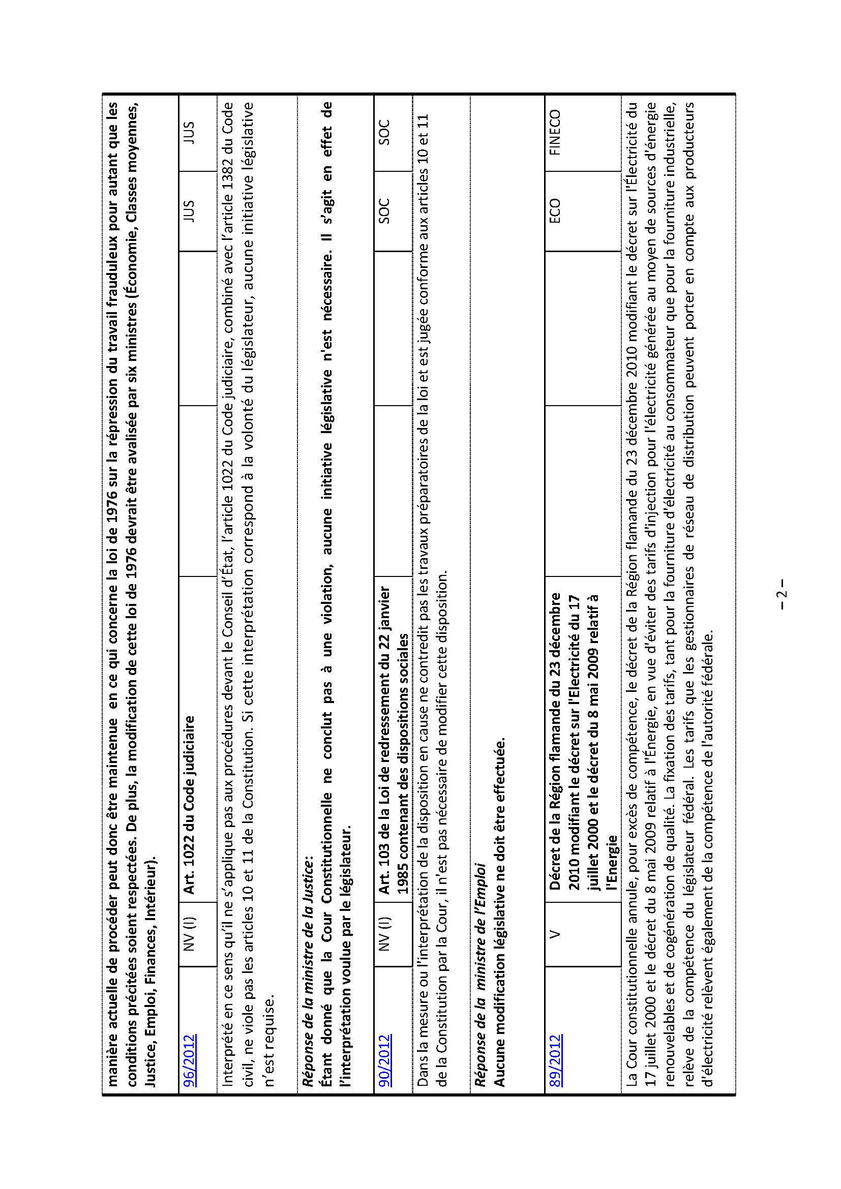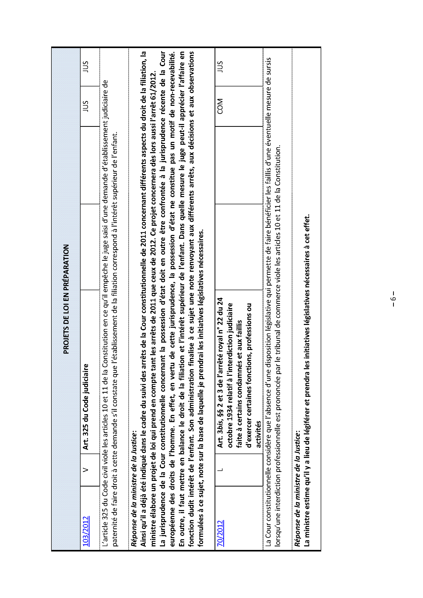 Uit de analyse van de antwoorden van de commissies en de regering met betrekking tot de arresten gewezen in 2011 en 2012 bleek dat voor een aantal arresten de regering een wetsontwerp voorbereidde of te kennen gaf het probleem te onderzoeken vooraleer een wetgevend initiatief te nemen en dat voor sommige arresten reeds wetsvoorstellen werden ingediend in Kamer of Senaat.