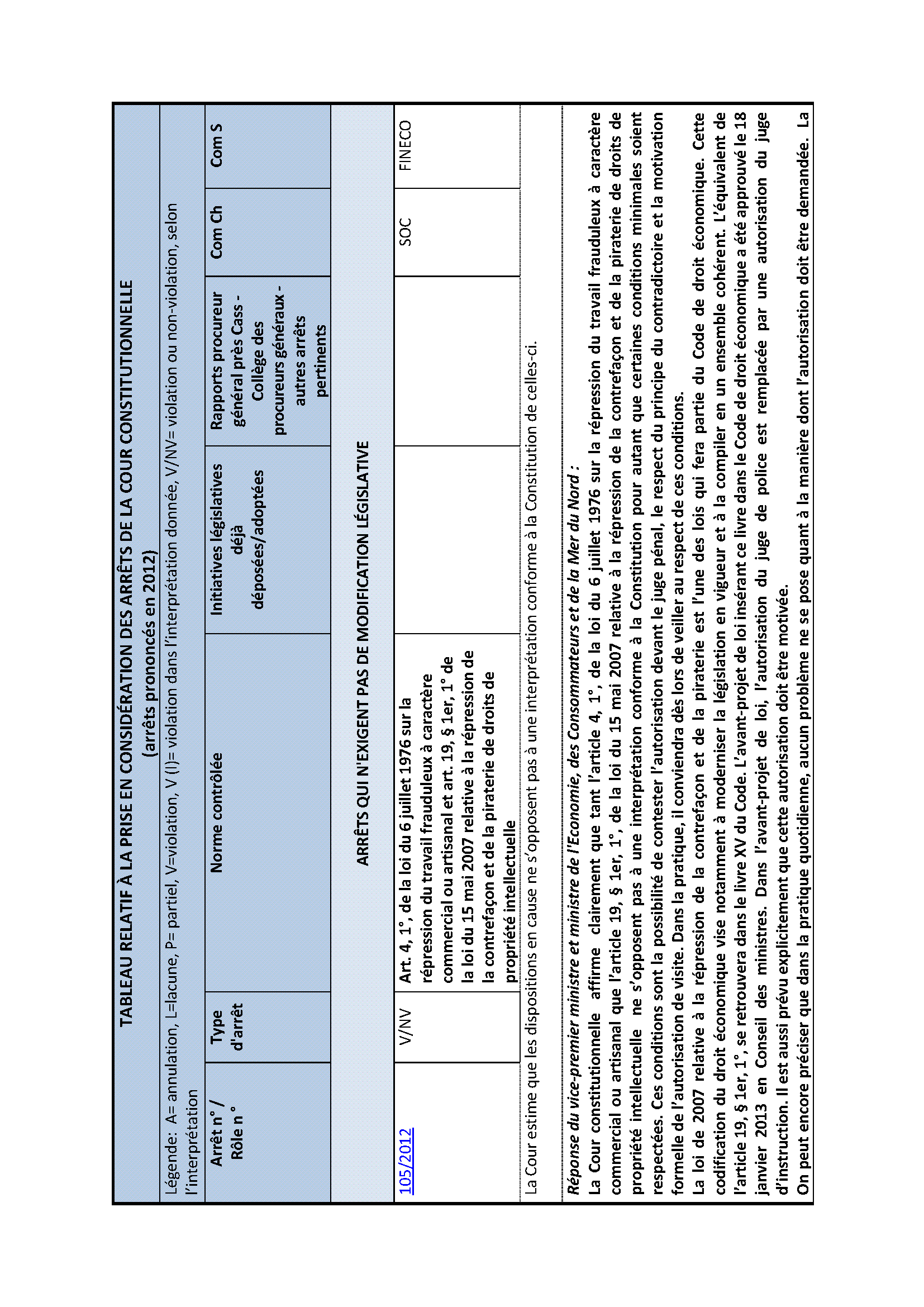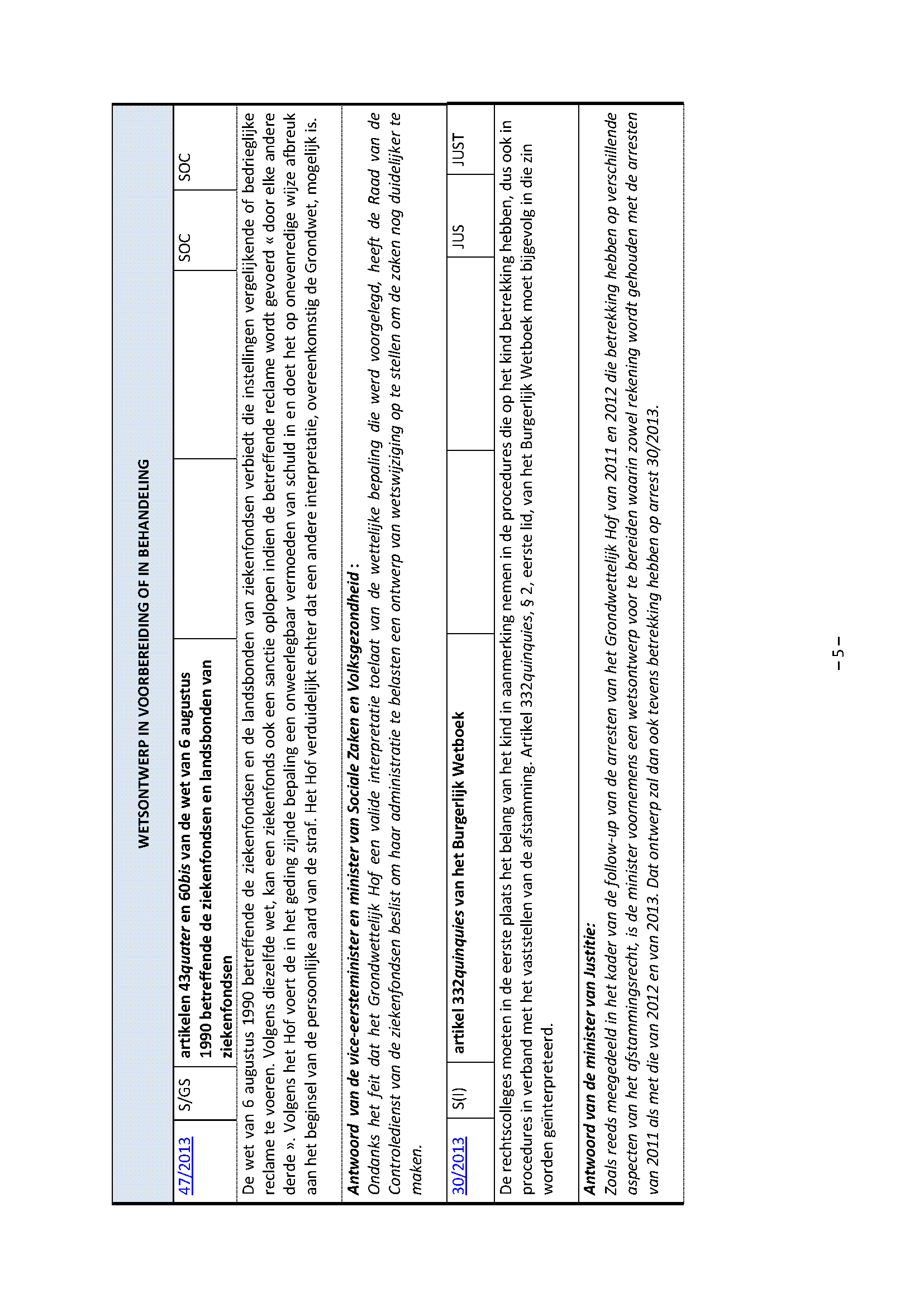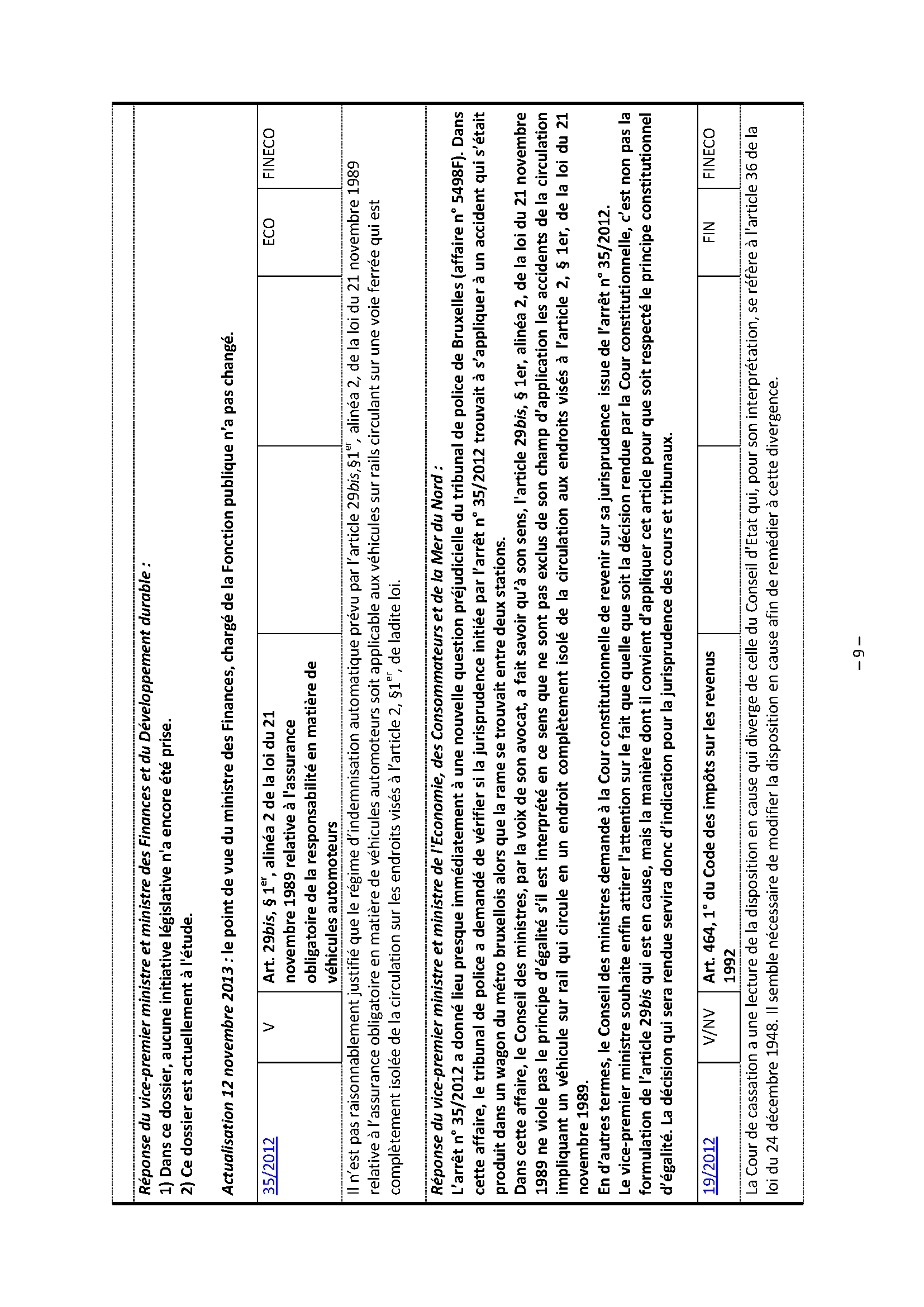Uit de analyse van de antwoorden van de commissies en de regering met betrekking tot de arresten gewezen in 2011 en 2012 bleek dat voor een aantal arresten de regering een wetsontwerp voorbereidde of te kennen gaf het probleem te onderzoeken vooraleer een wetgevend initiatief te nemen en dat voor sommige arresten reeds wetsvoorstellen werden ingediend in Kamer of Senaat.