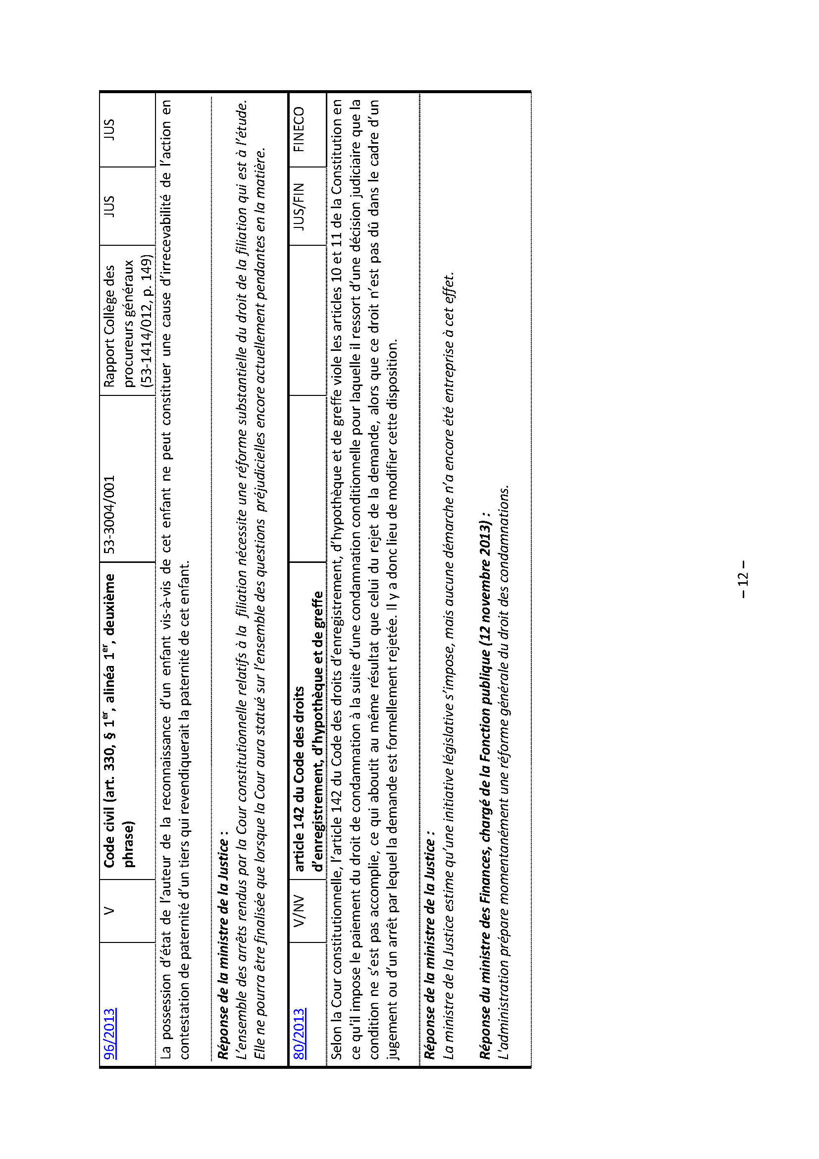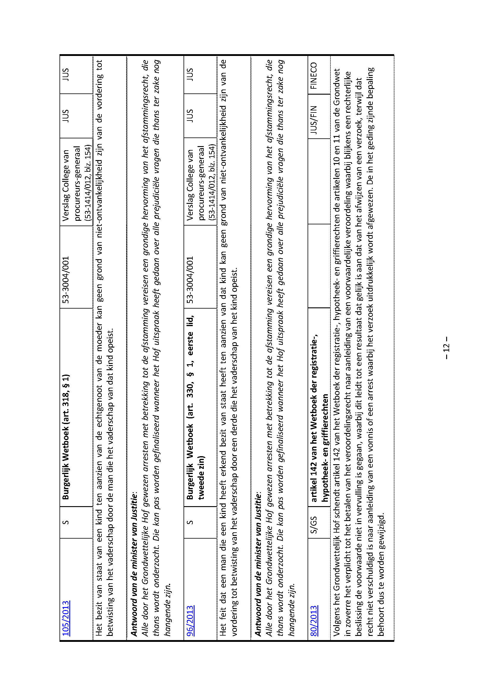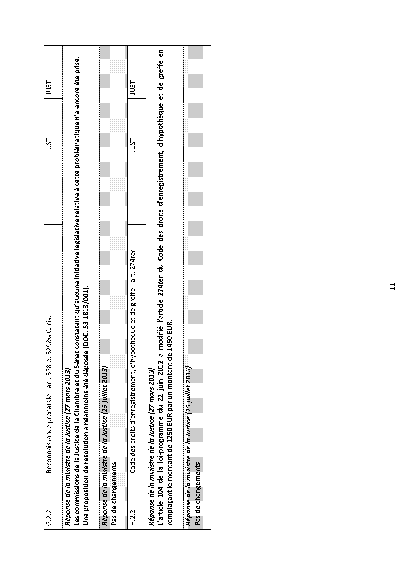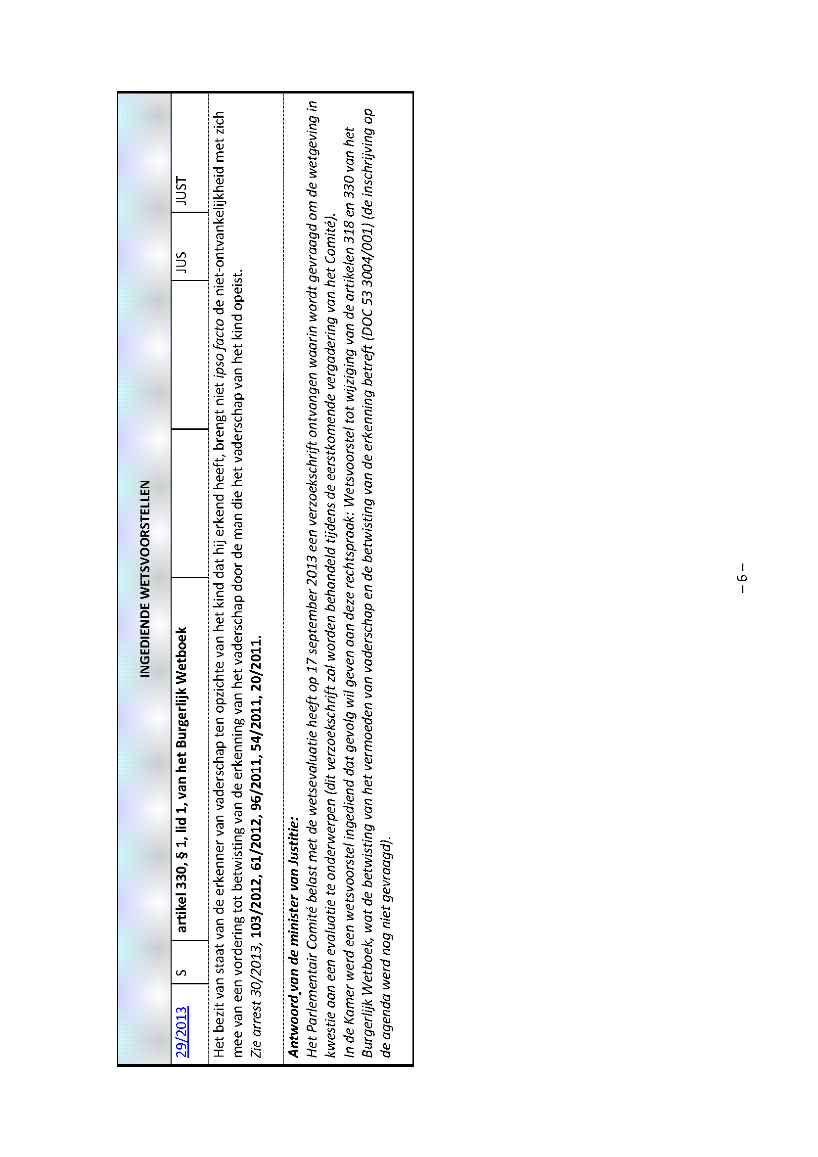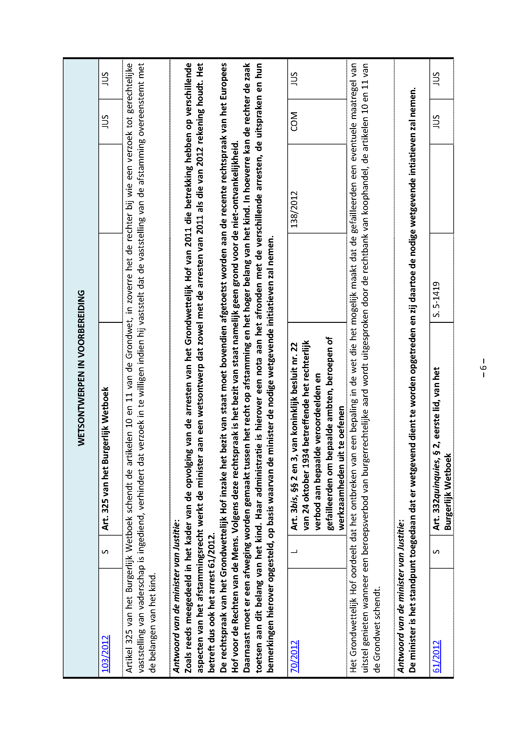 De minister van Justitie deelde tijdens de vergadering van 24 februari 2014 mee dat de arresten met betrekking tot de afstammingsproblematiek (onder meer de arresten 20/2011, 54/2011, 96/2011, 61/2012, 103/2012 en 30/2013) een substantiële hervorming van het afstammingsrecht vereisen die op dit ogenblik nog ter studie is. De minister wacht echter nog de arresten af met betrekking tot de nog hangende prejudiciële vragen in deze materie.