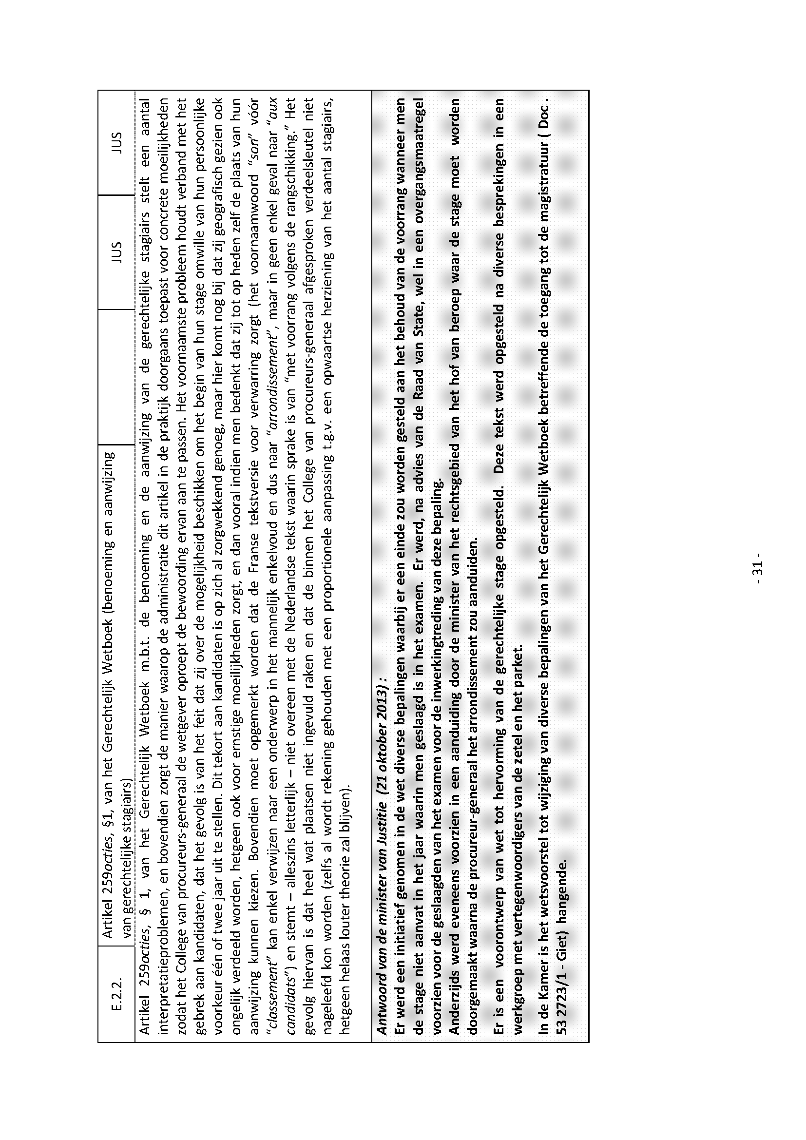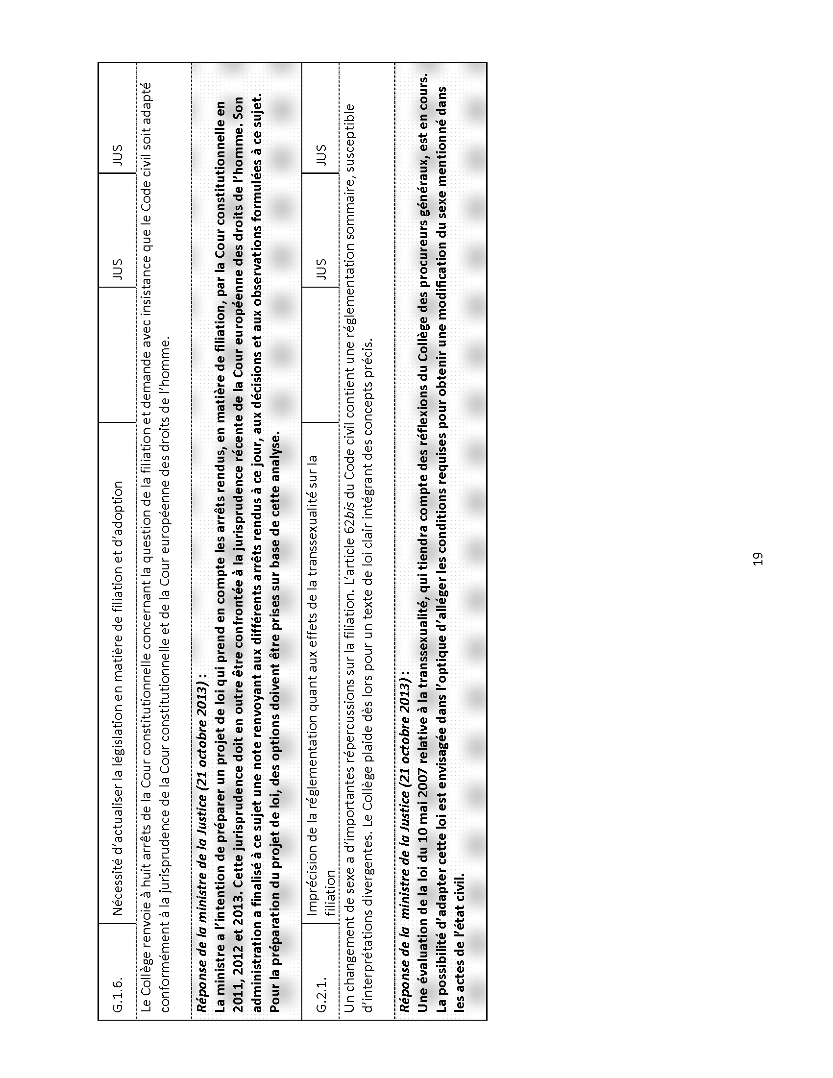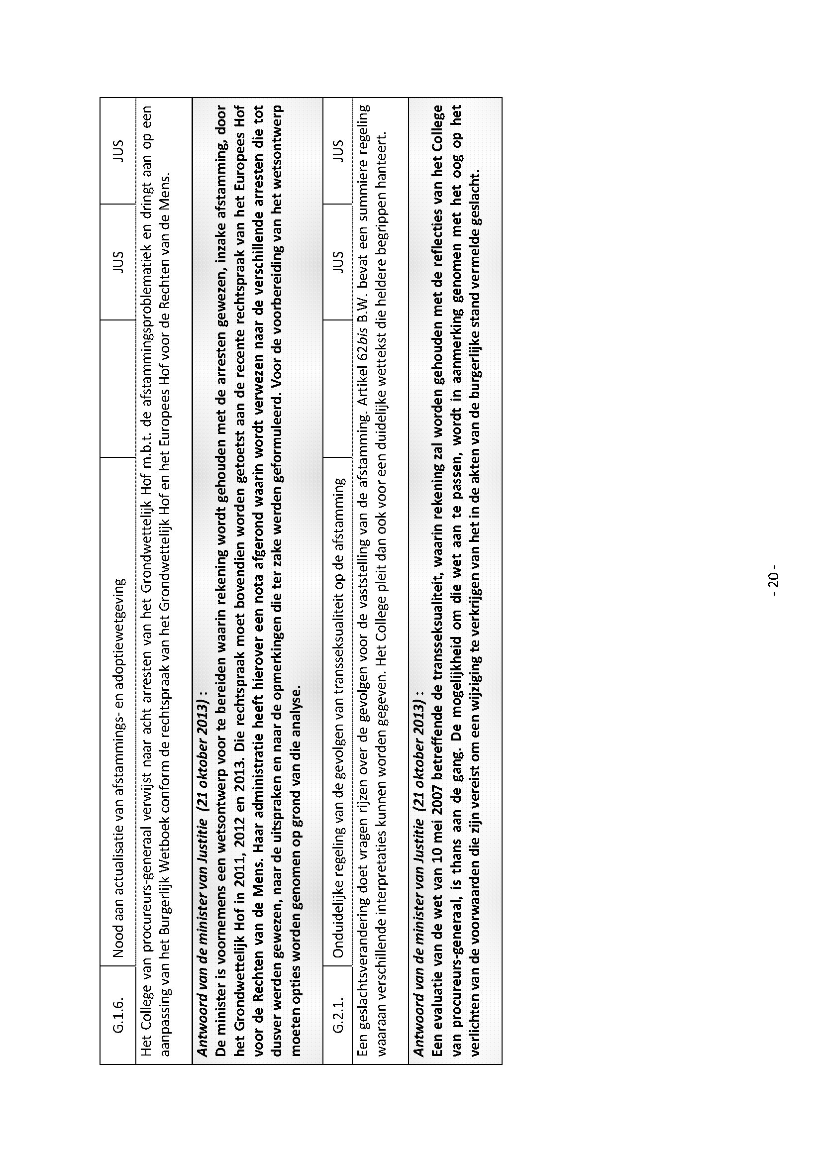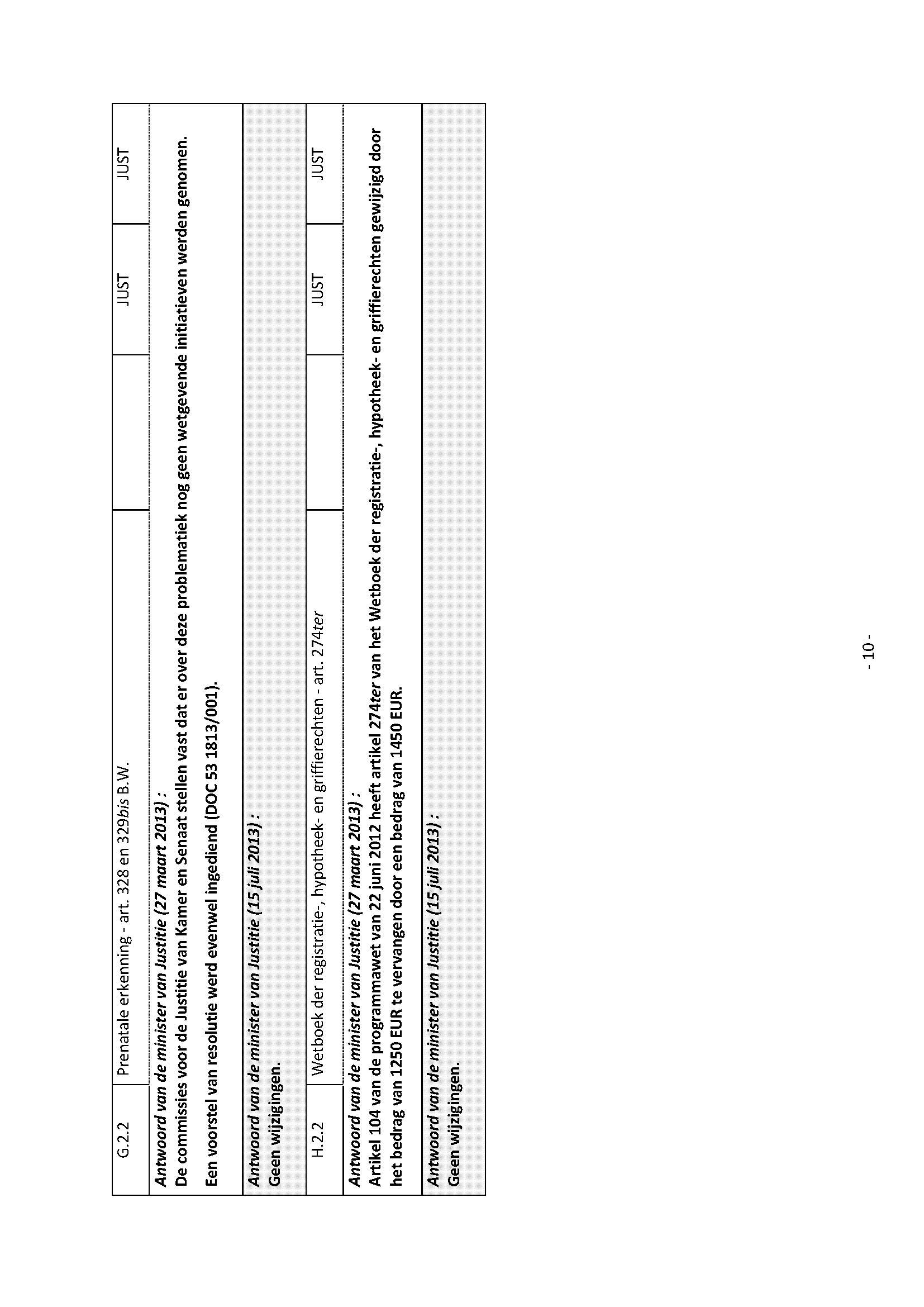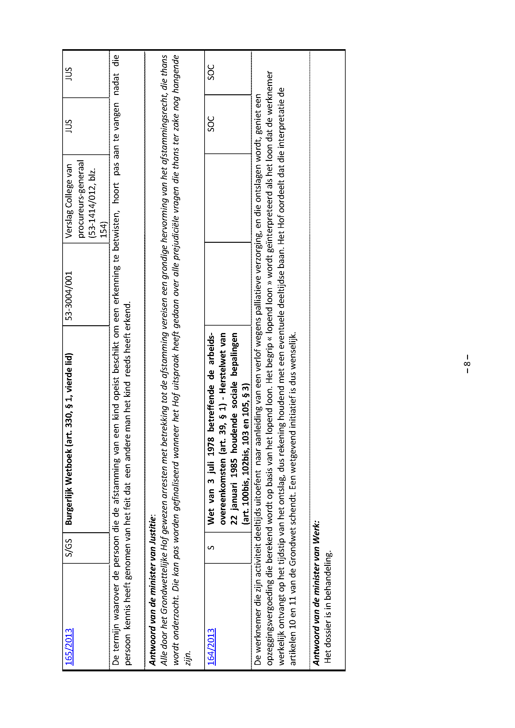 De minister van Justitie deelde tijdens de vergadering van 24 februari 2014 mee dat de arresten met betrekking tot de afstammingsproblematiek (onder meer de arresten 20/2011, 54/2011, 96/2011, 61/2012, 103/2012 en 30/2013) een substantiële hervorming van het afstammingsrecht vereisen die op dit ogenblik nog ter studie is. De minister wacht echter nog de arresten af met betrekking tot de nog hangende prejudiciële vragen in deze materie.