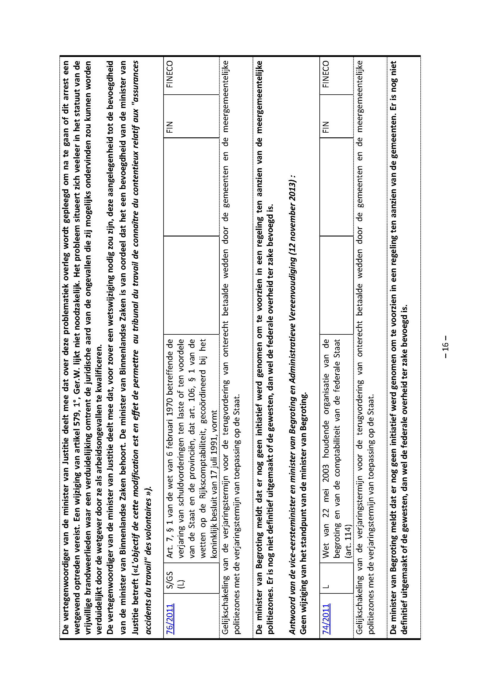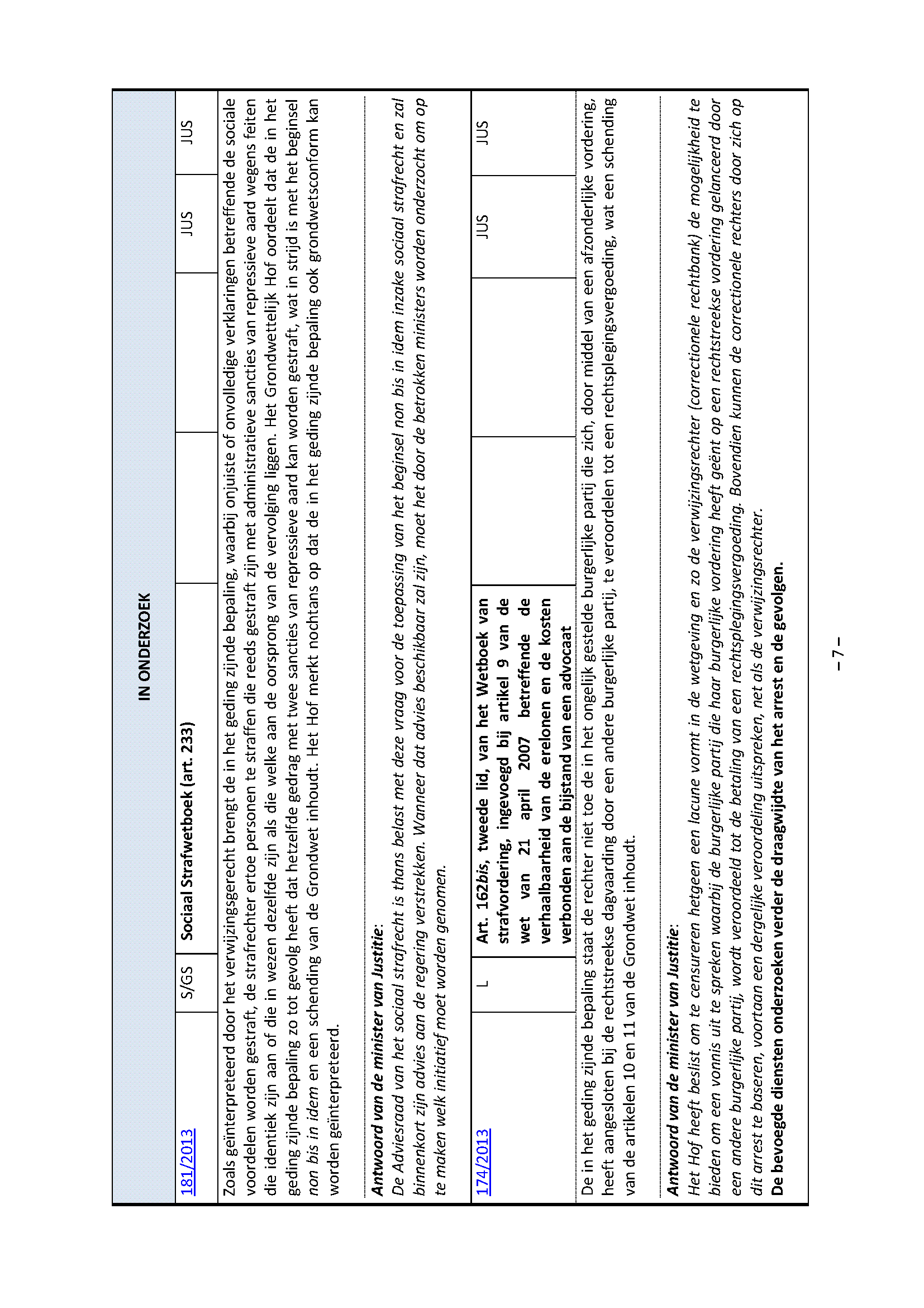 Wat de zestien arresten van 2012 betreft, bleek dat drie arresten reeds aanleiding hadden gegeven tot een wetswijziging, voor drie arresten een wetsontwerp in voorbereiding of in behandeling was en voor tien arresten de problematiek nog door de regering werd onderzocht.