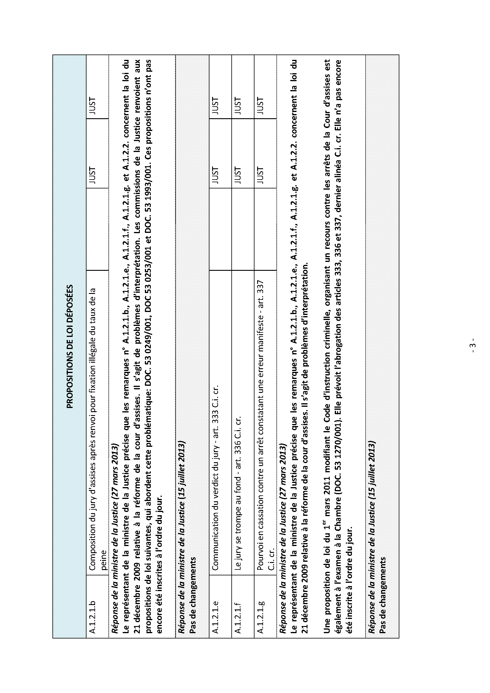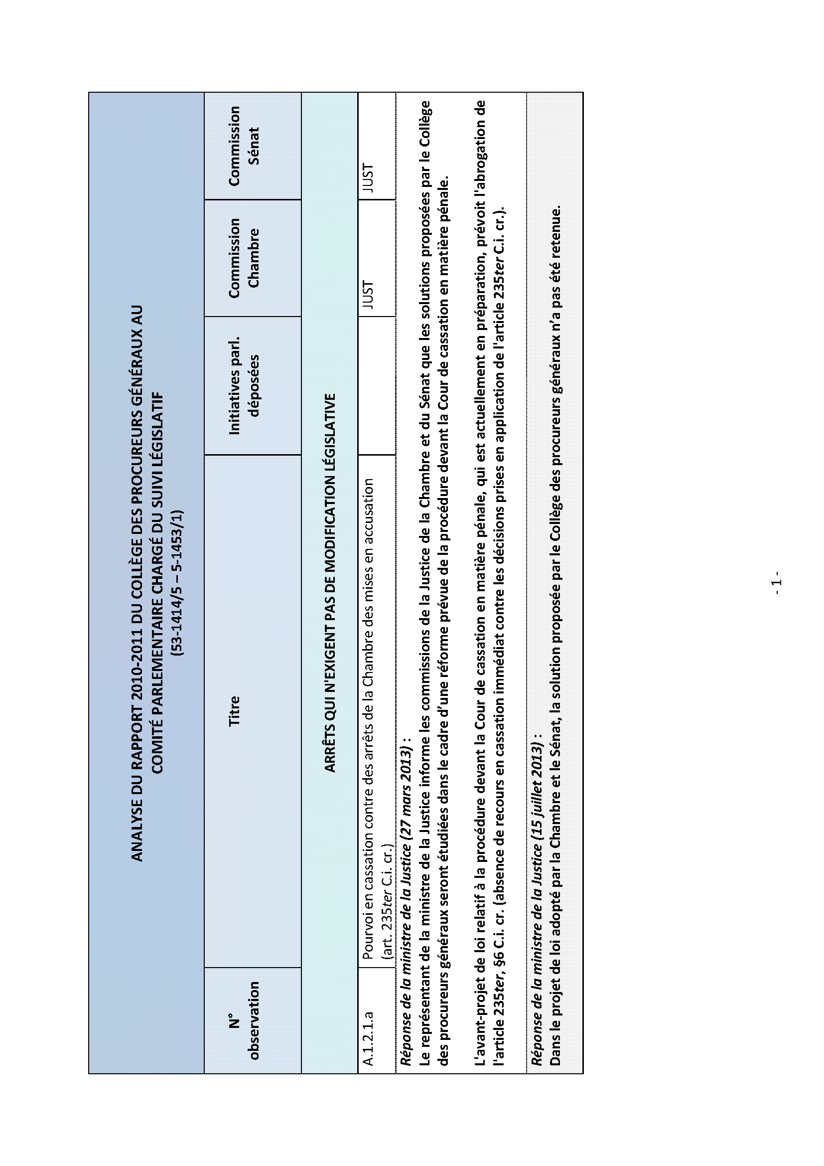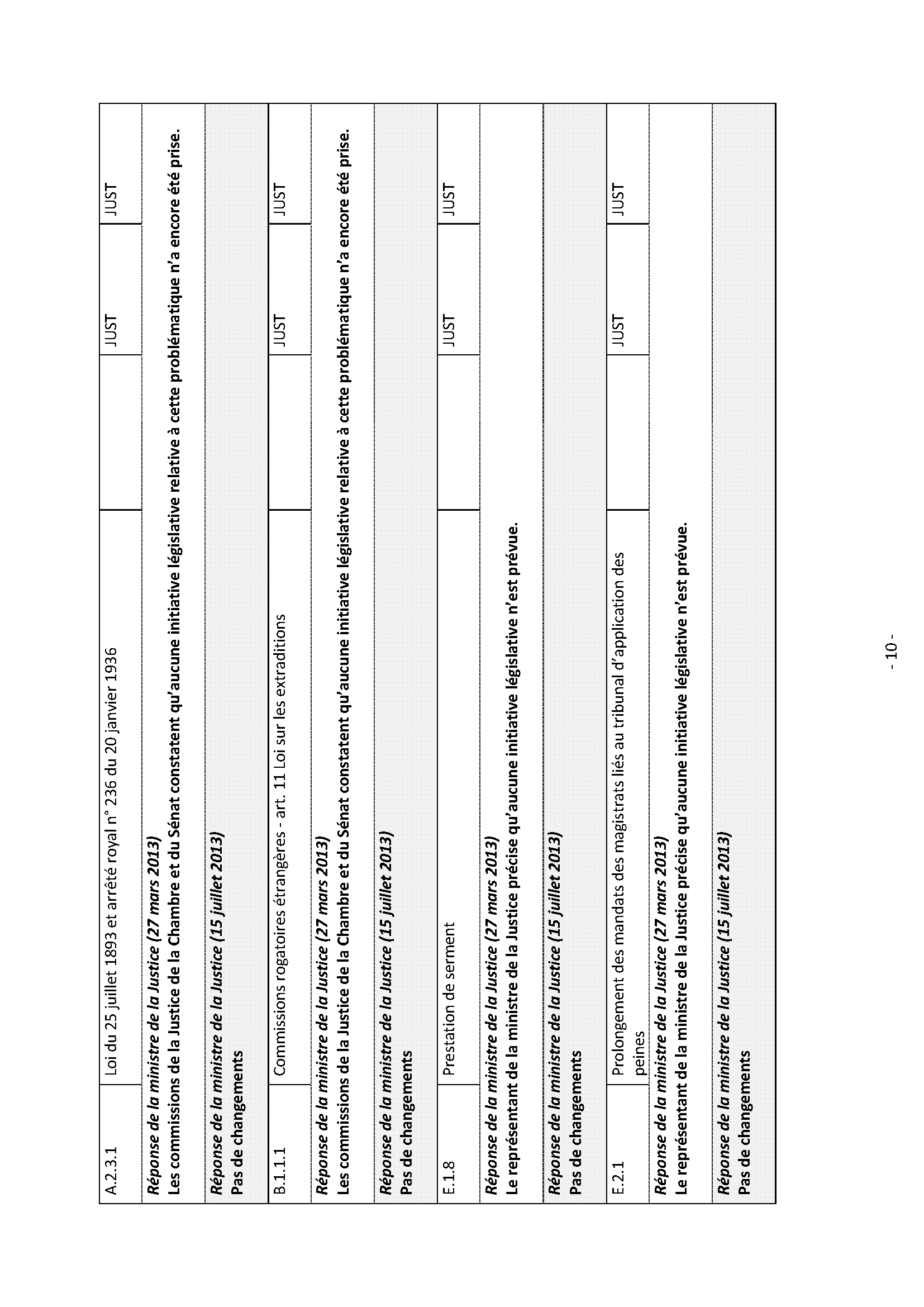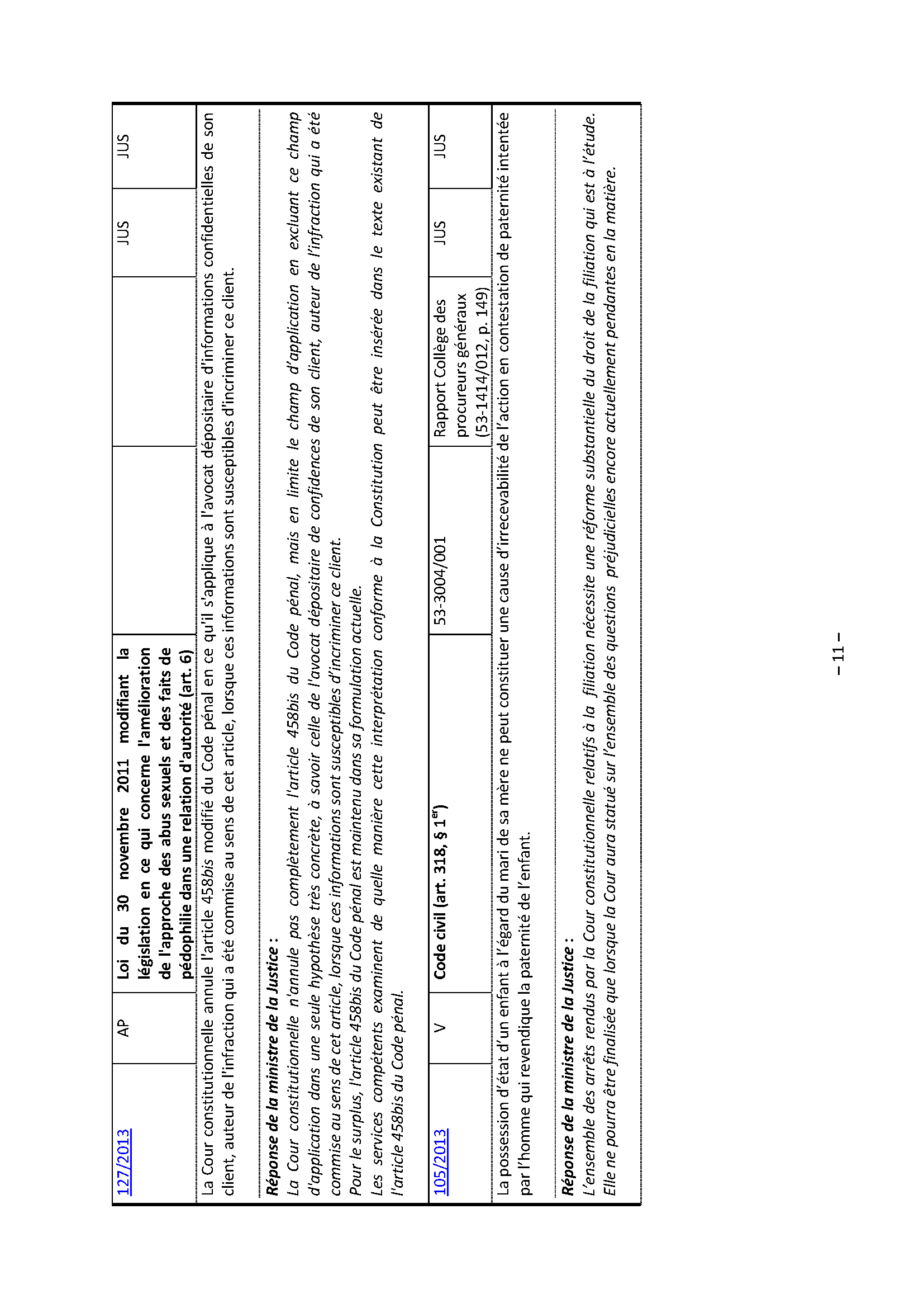 De tabellen opgenomen in de bijlagen 1, 2 en 3 bevatten respectievelijk de geactualiseerde antwoorden van de commissies van Kamer en Senaat op arresten gewezen in 2011, 2012 en 2013. Voor de arresten die inmiddels aanleiding hebben gegeven tot een wetswijziging, werd het antwoord van de commissie of de minister vervangen door het opschrift van die wet.