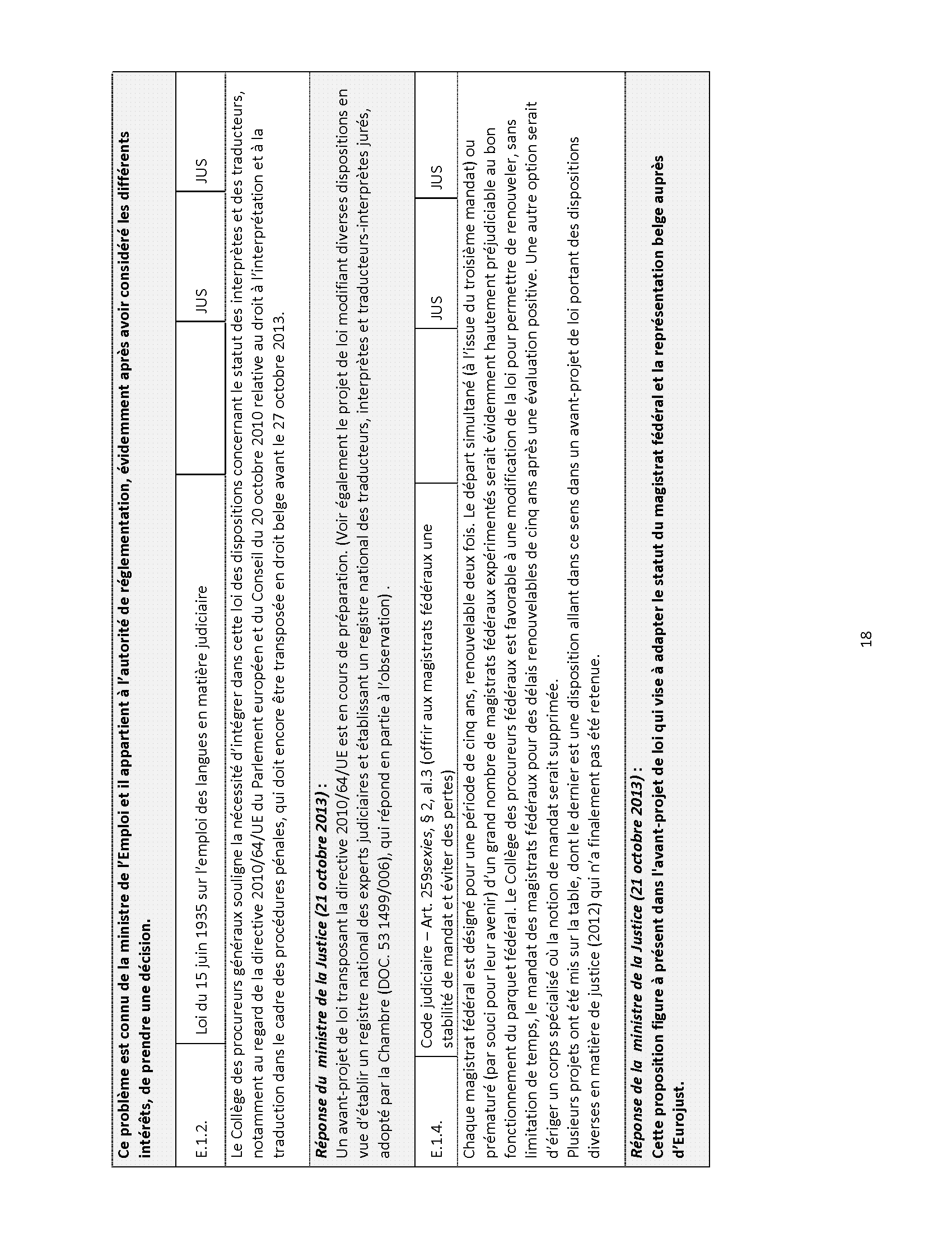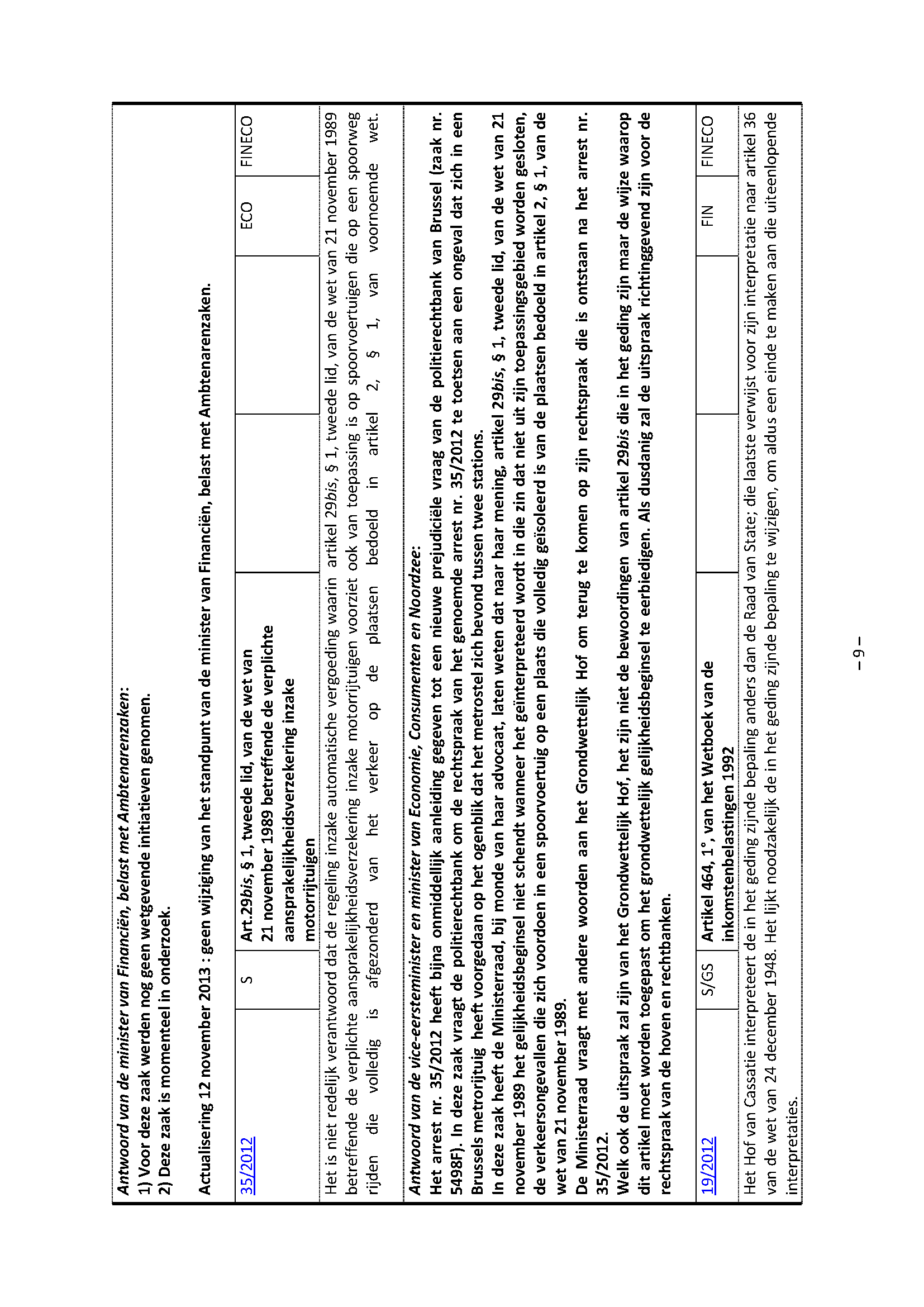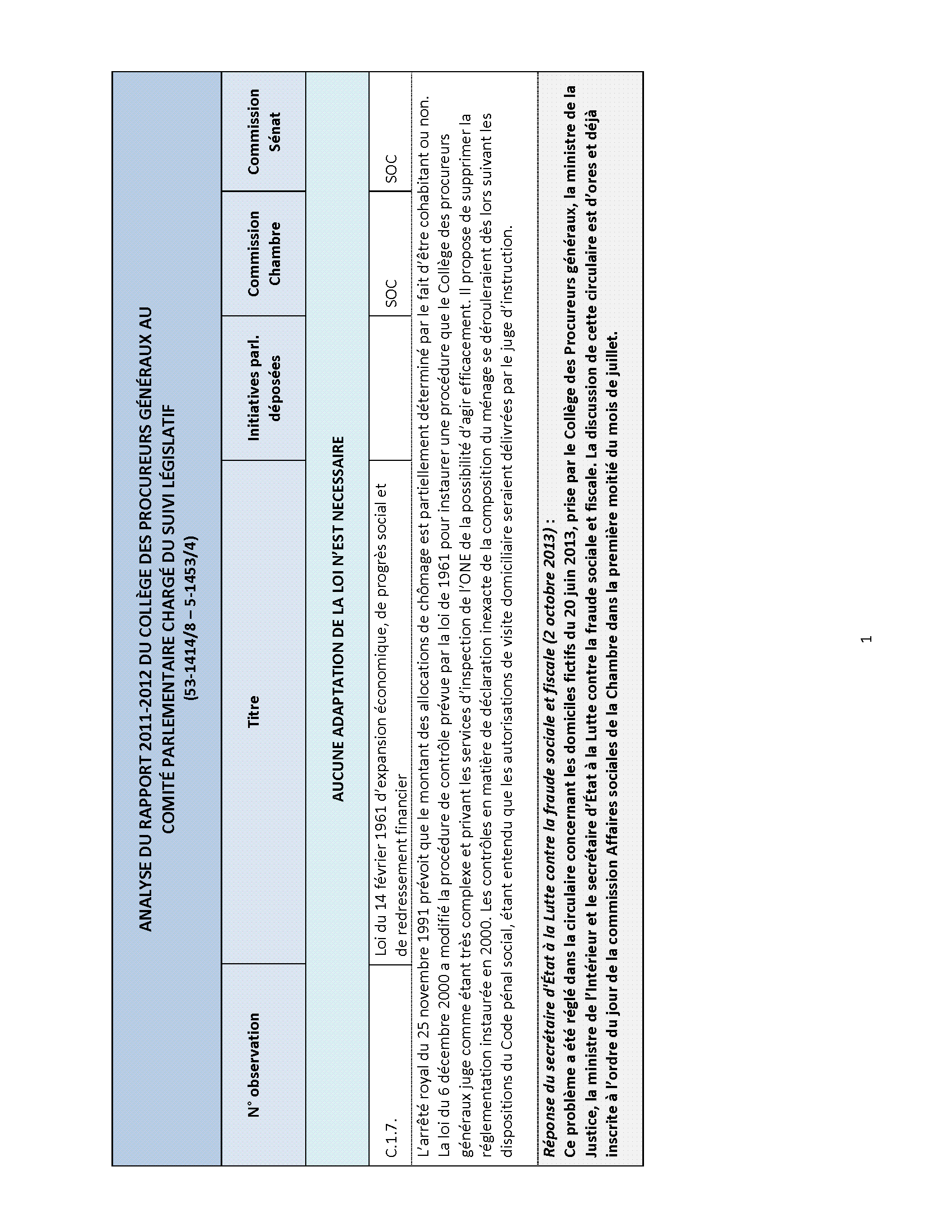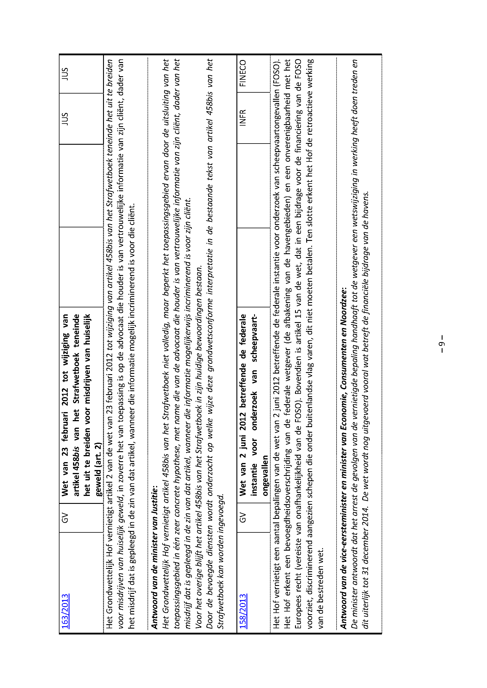 De tabellen opgenomen in de bijlagen 1, 2 en 3 bevatten respectievelijk de geactualiseerde antwoorden van de commissies van Kamer en Senaat op arresten gewezen in 2011, 2012 en 2013. Voor de arresten die inmiddels aanleiding hebben gegeven tot een wetswijziging, werd het antwoord van de commissie of de minister vervangen door het opschrift van die wet.