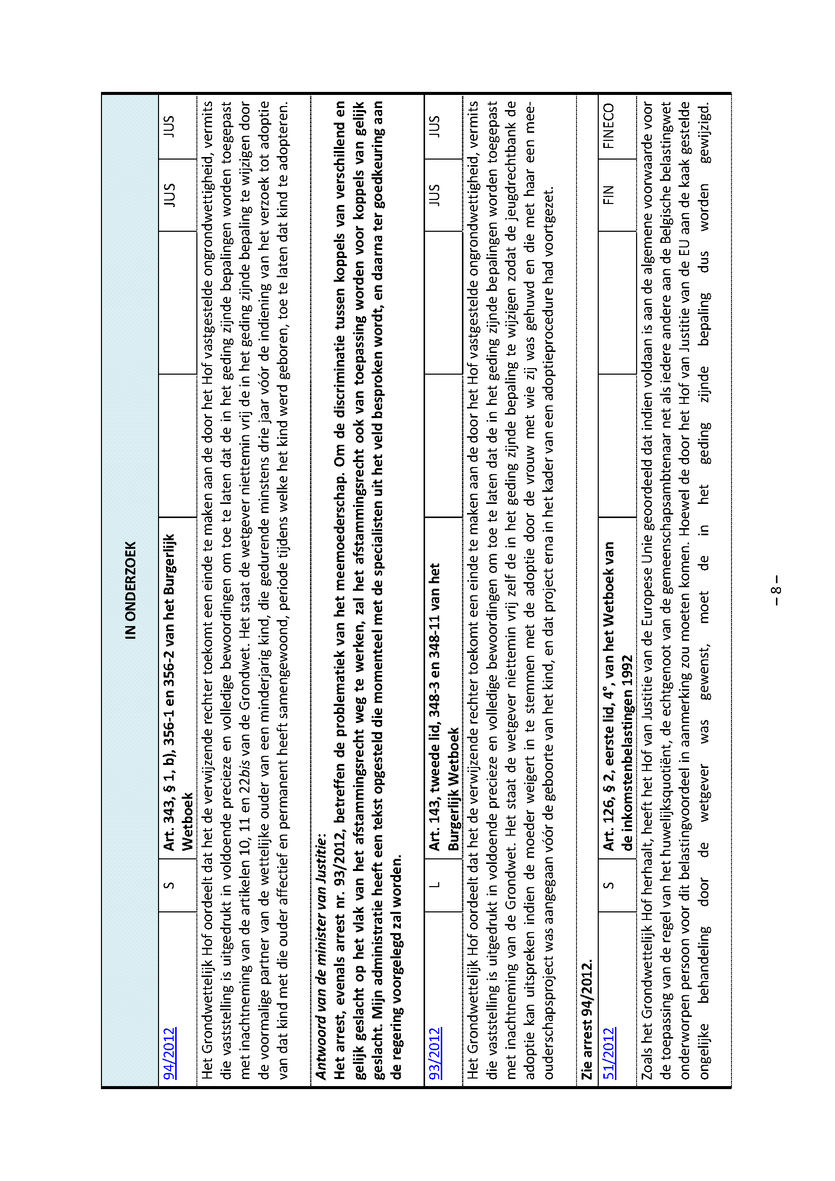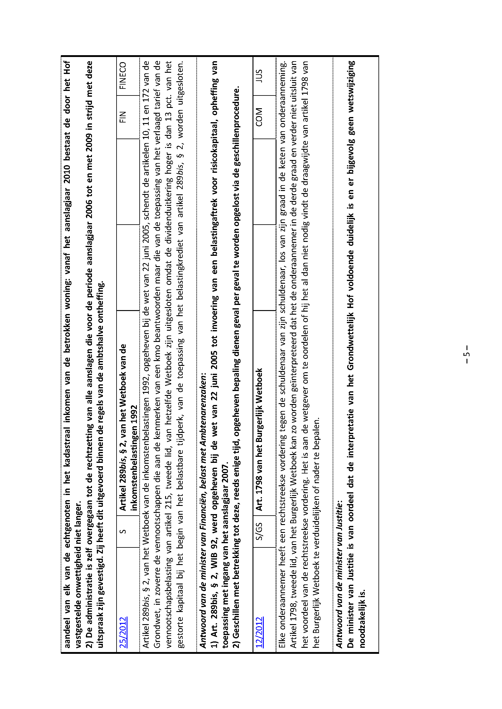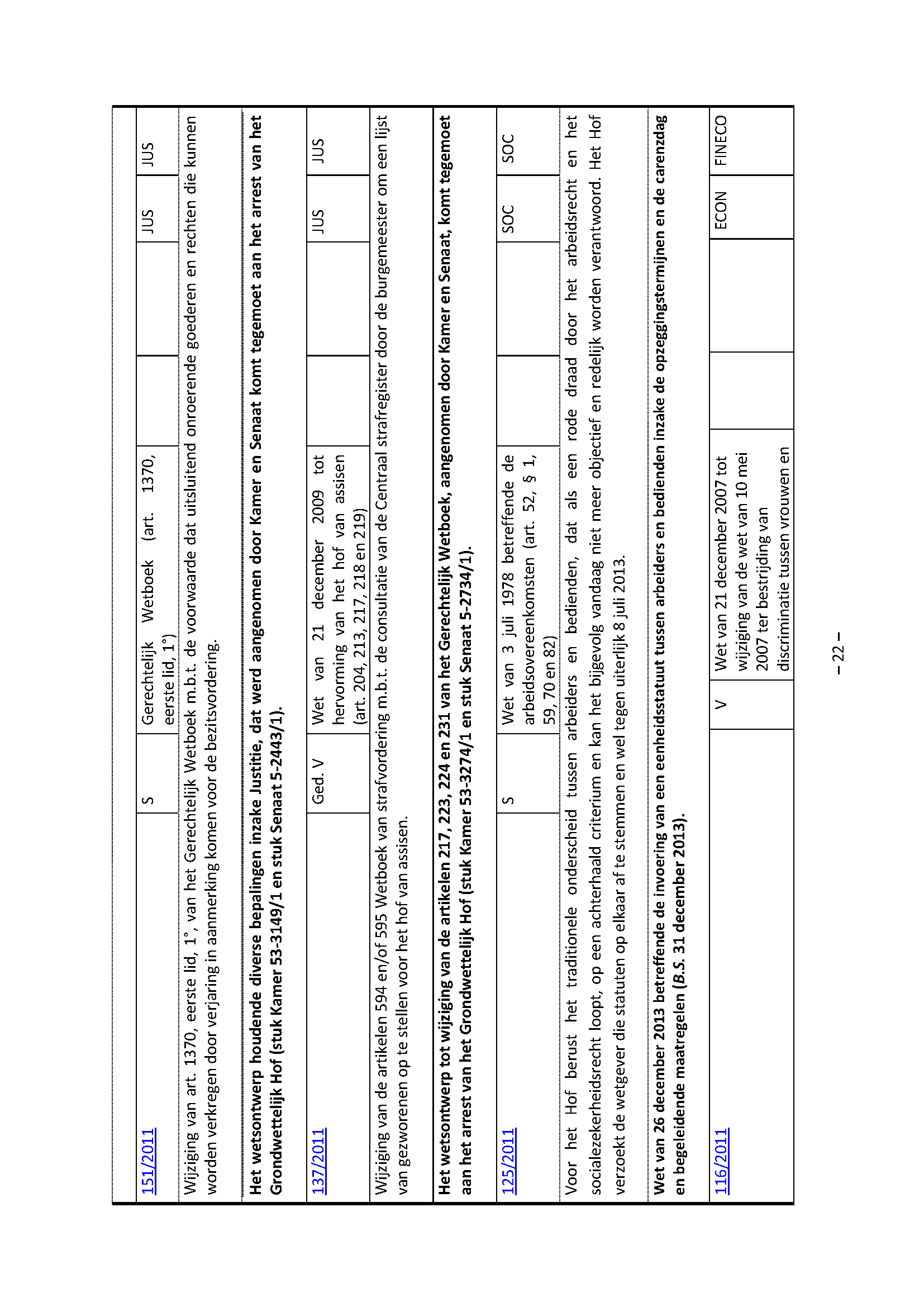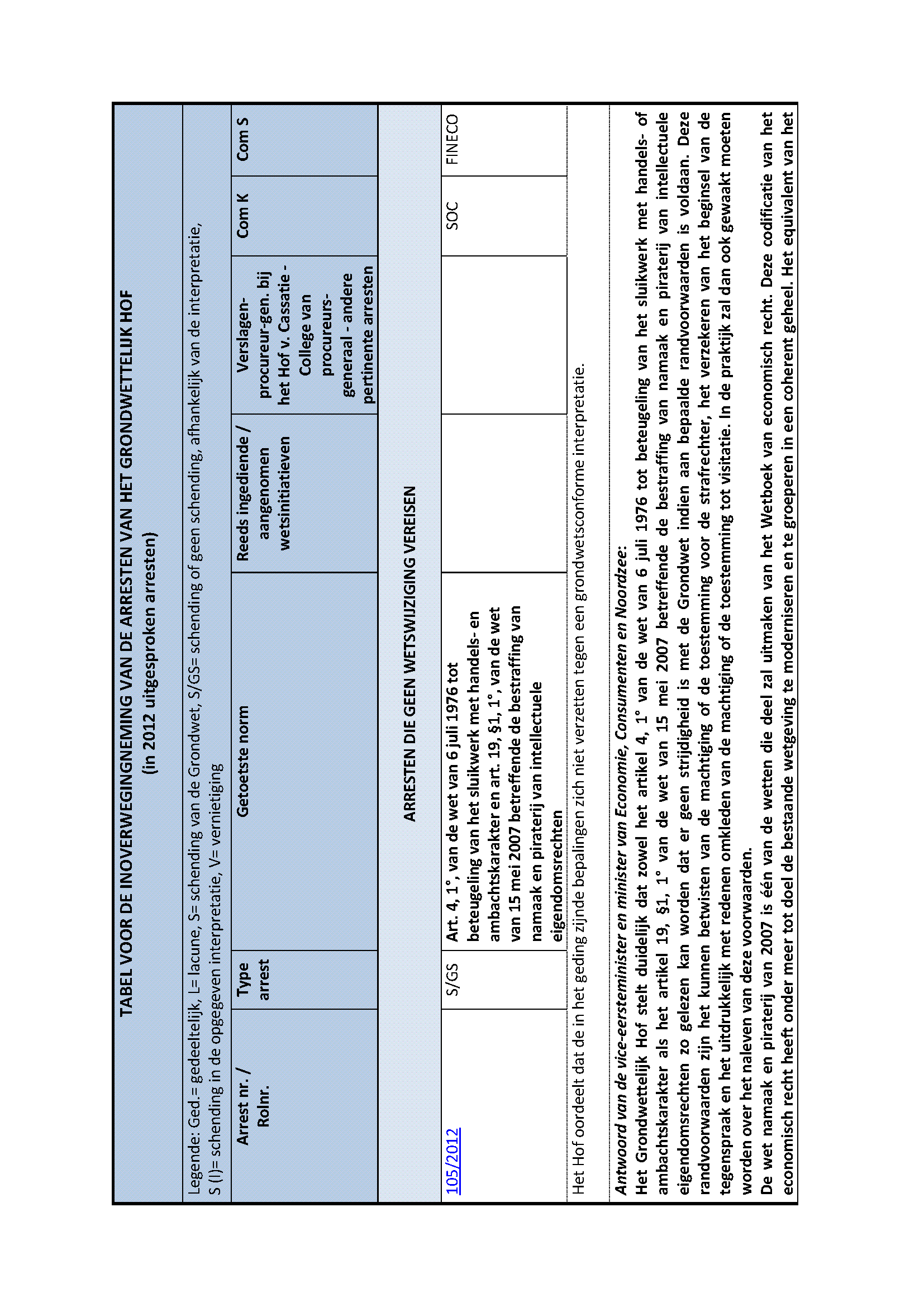 Bijlage 2. Tabel voor de inoverwegingneming van de arresten van het Grondwettelijk Hof (in 2012 uitgesproken arresten).................................... blz. 116;