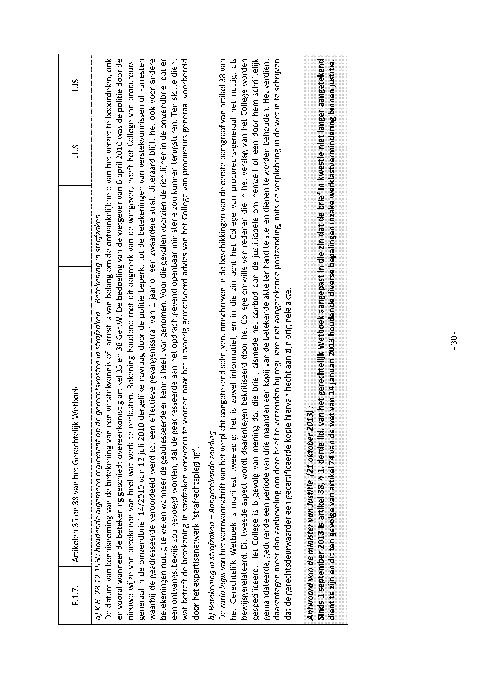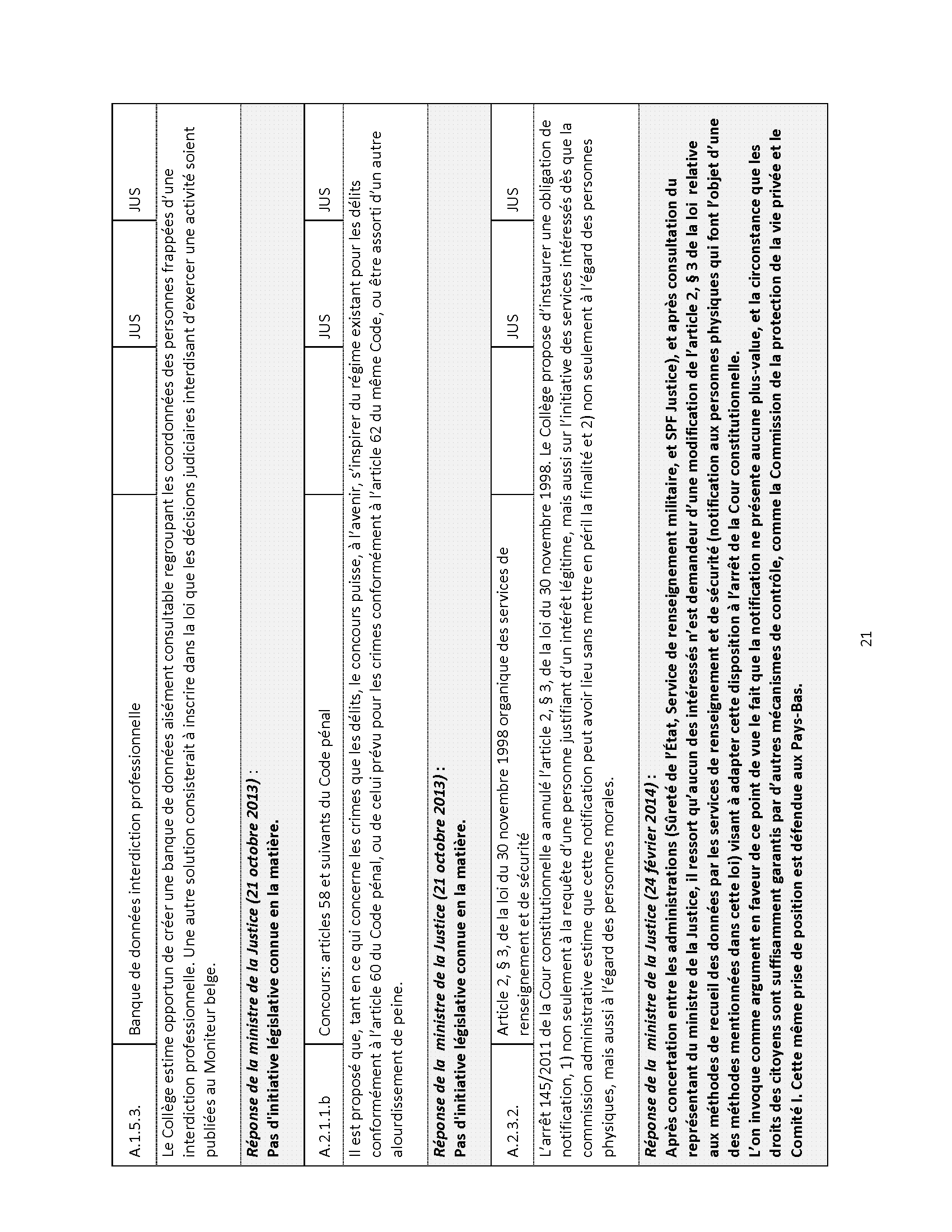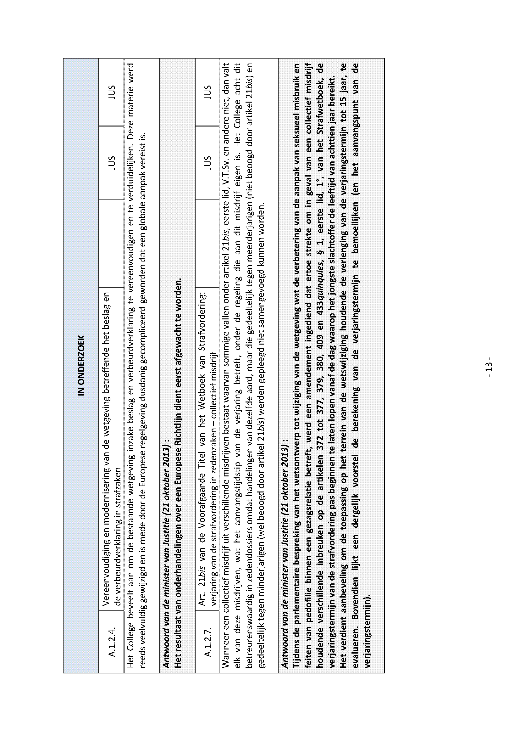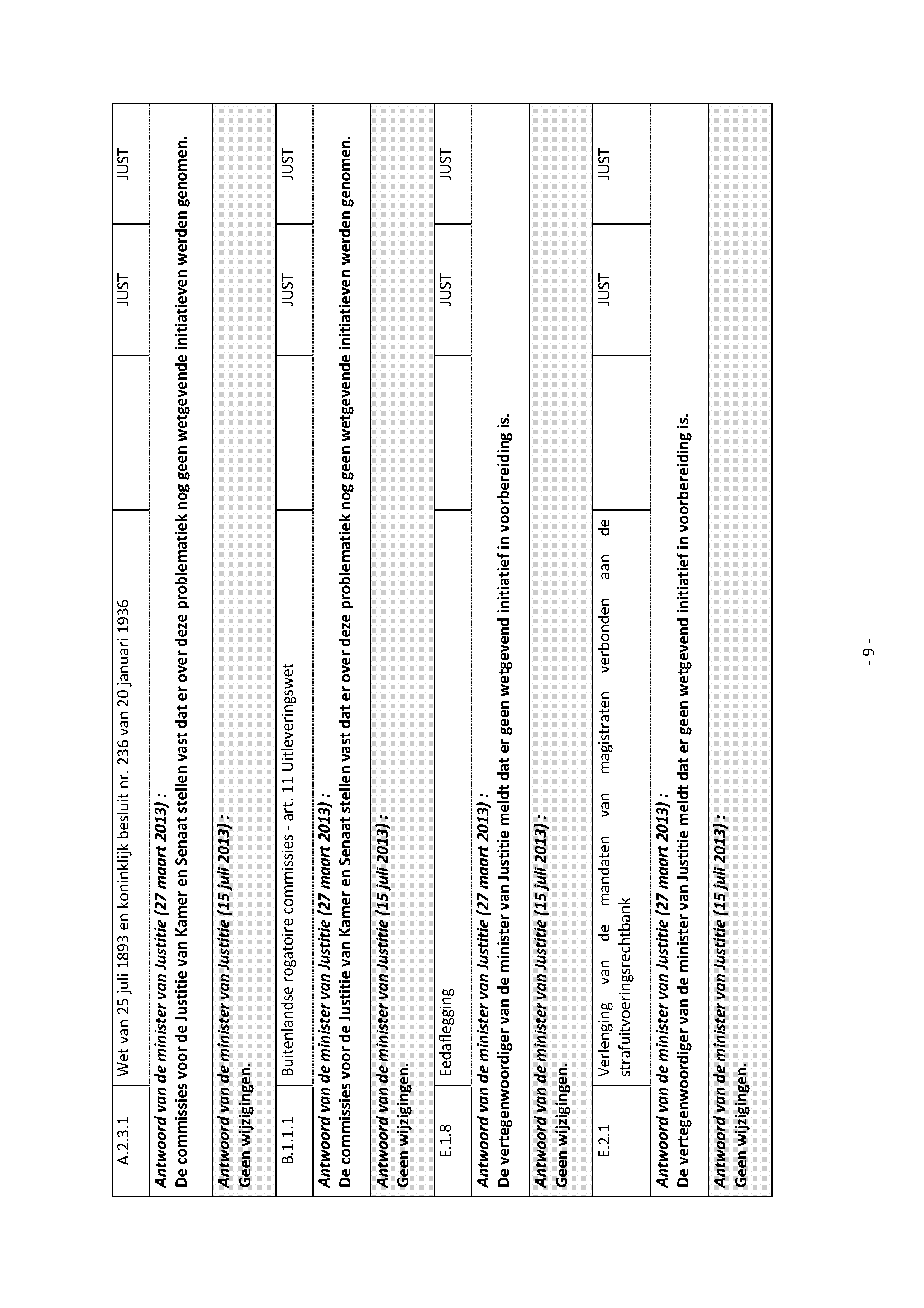 Tijdens zijn vergadering van 13 januari 2014 nam het Comité kennis van de antwoorden van de commissies. Het stelde vast dat uit de antwoorden van de minister van Justitie blijkt dat voor bepaalde opmerkingen een wetgevend initiatief wenselijk is of eventueel kan worden overwogen, doch dat geen concreet initiatief wordt aangekondigd. Het nodigde de minister uit om toe te lichten hoe het best gevolg kon worden gegeven aan deze opmerkingen.
