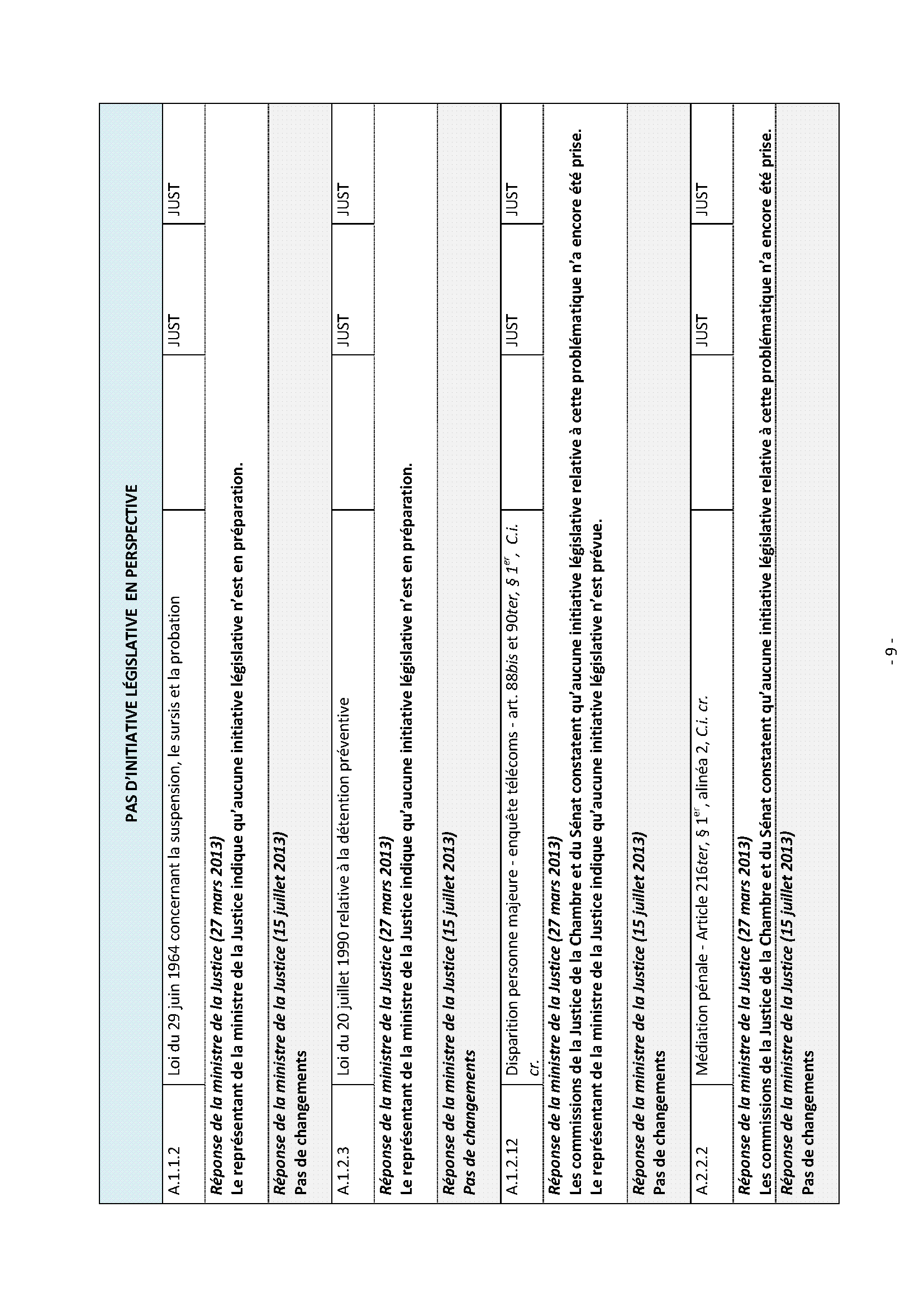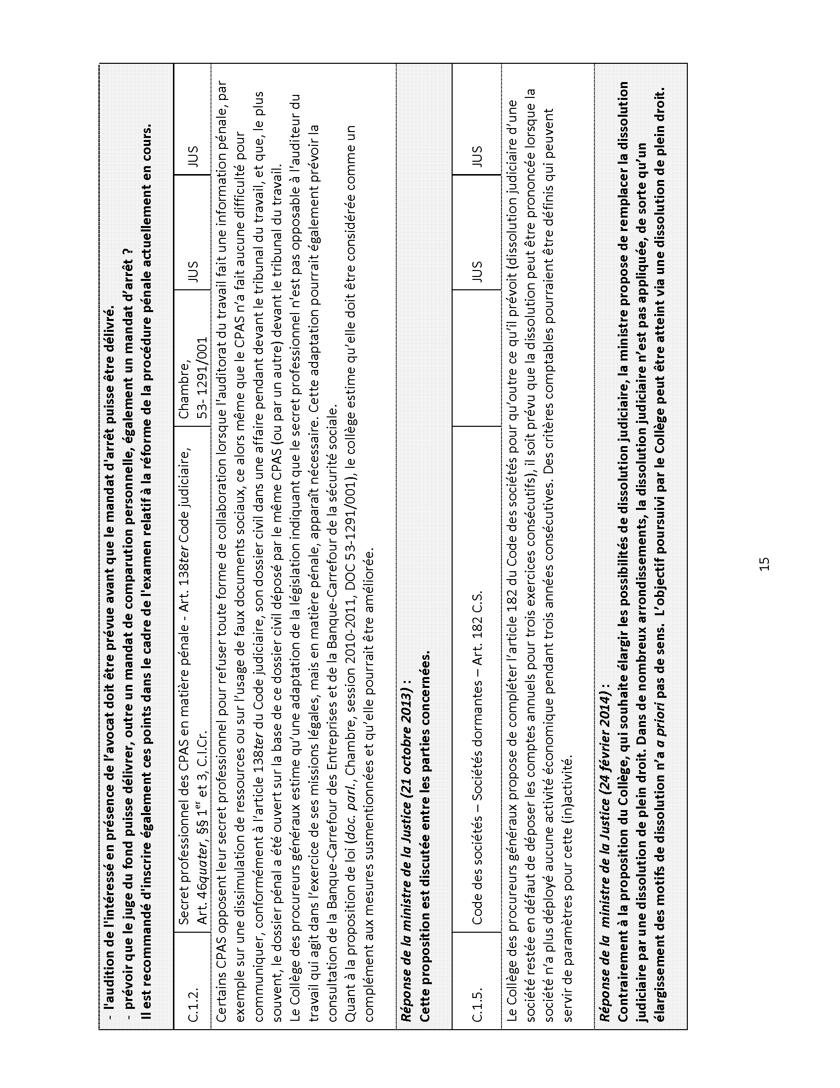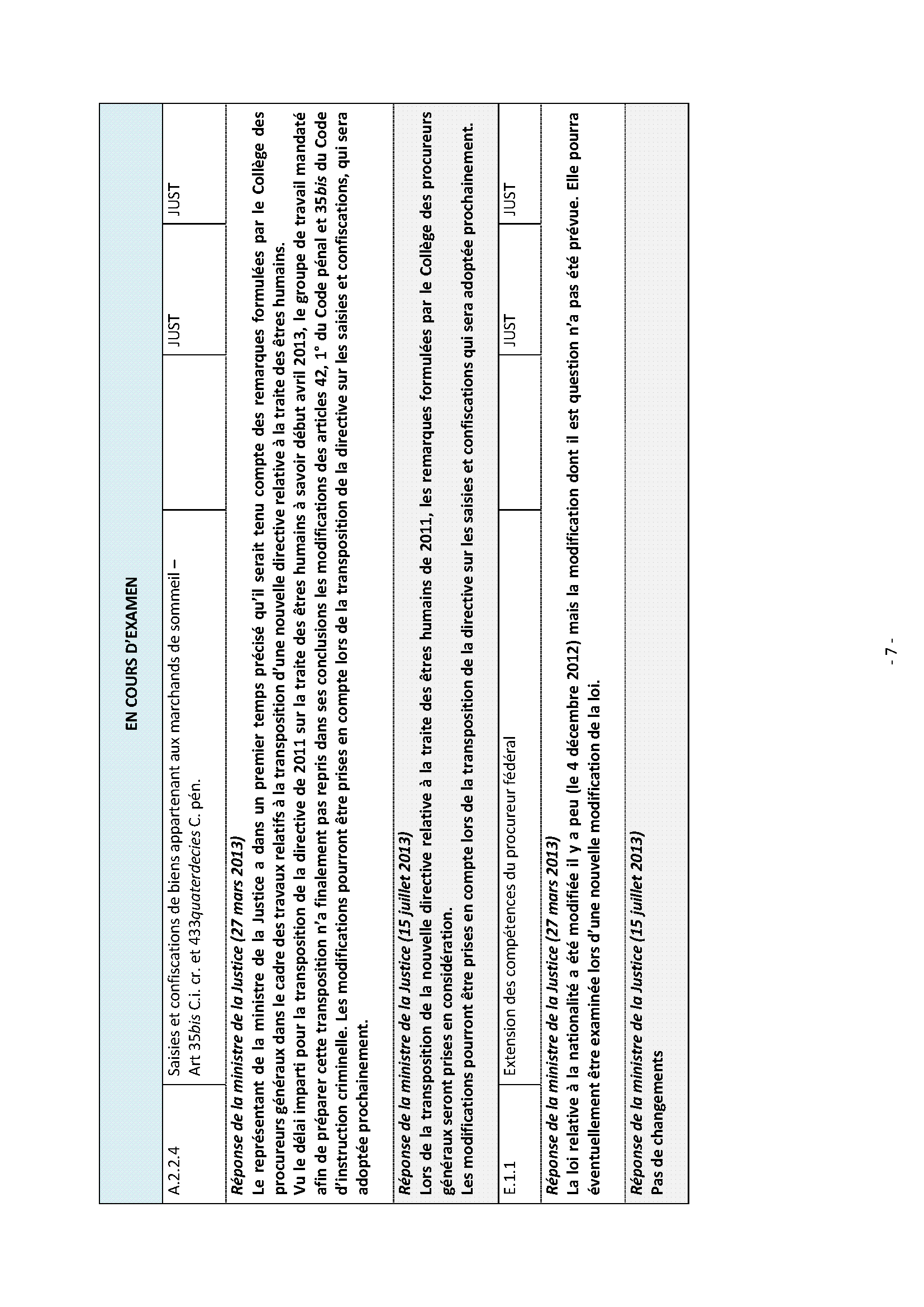 Tijdens zijn vergadering van 13 januari 2014 nam het Comité kennis van de antwoorden van de commissies. Het stelde vast dat uit de antwoorden van de minister van Justitie blijkt dat voor bepaalde opmerkingen een wetgevend initiatief wenselijk is of eventueel kan worden overwogen, doch dat geen concreet initiatief wordt aangekondigd. Het nodigde de minister uit om toe te lichten hoe het best gevolg kon worden gegeven aan deze opmerkingen.