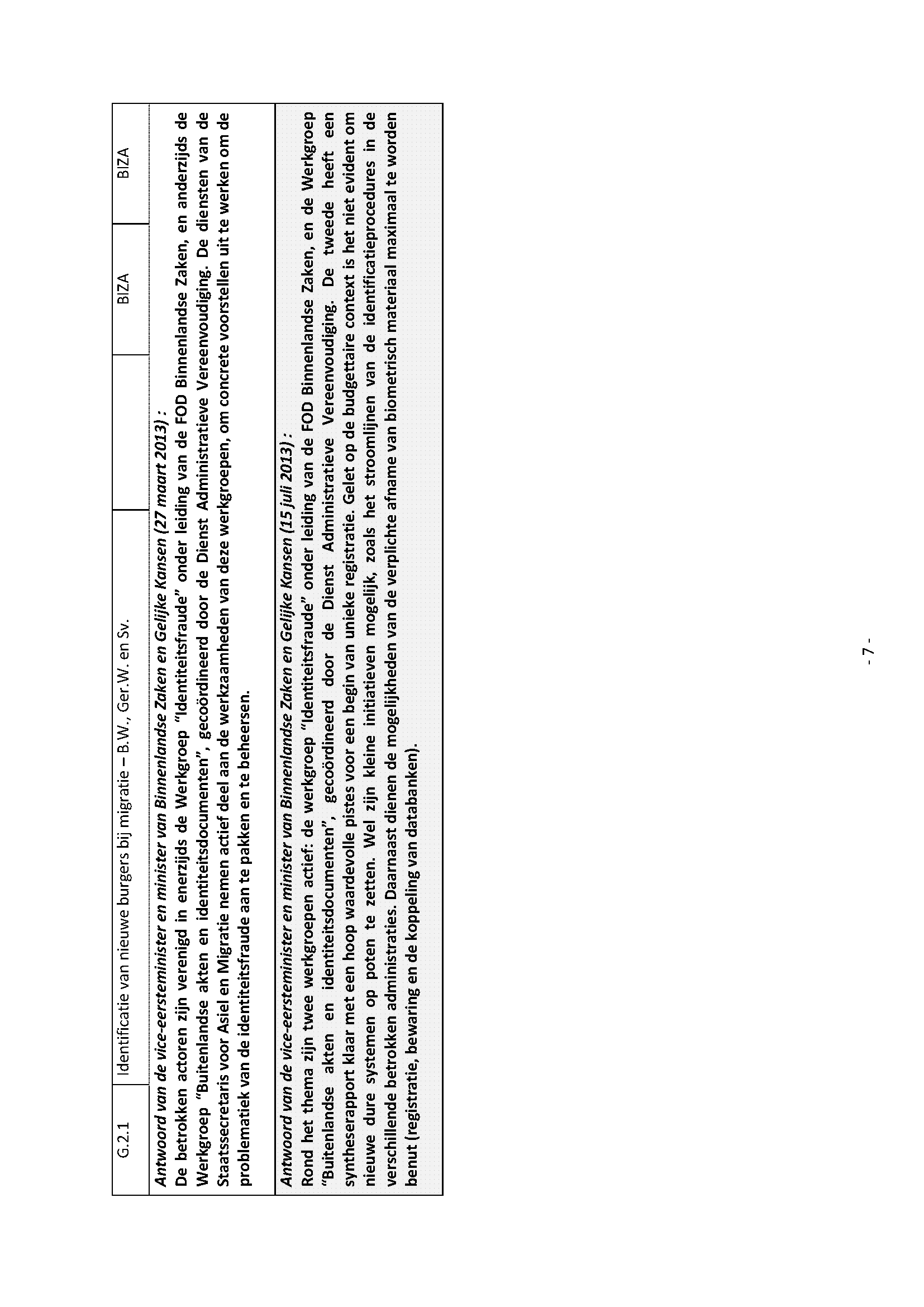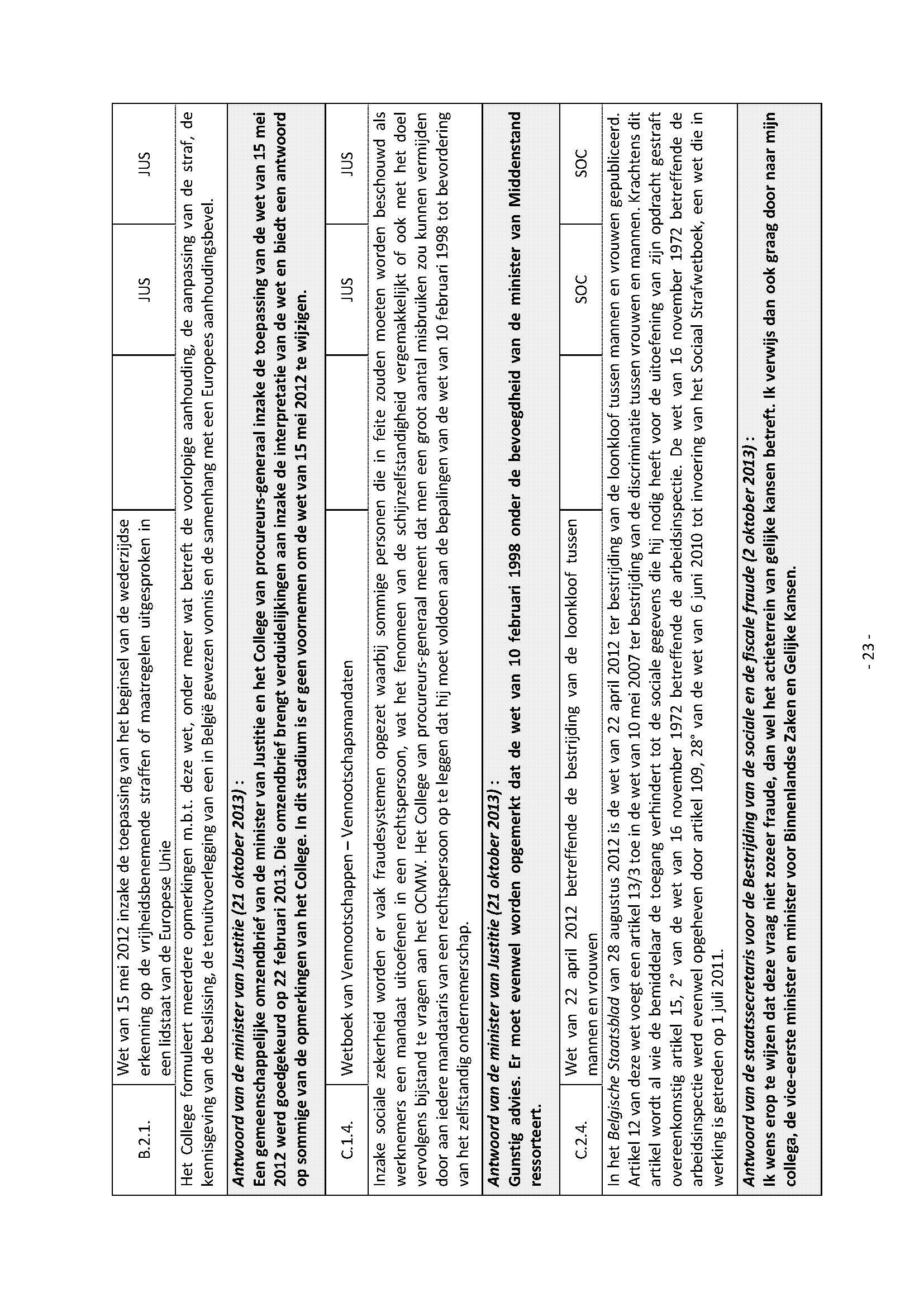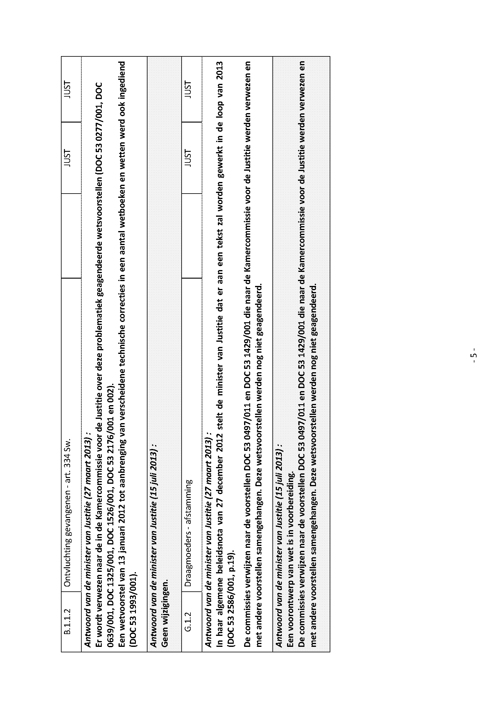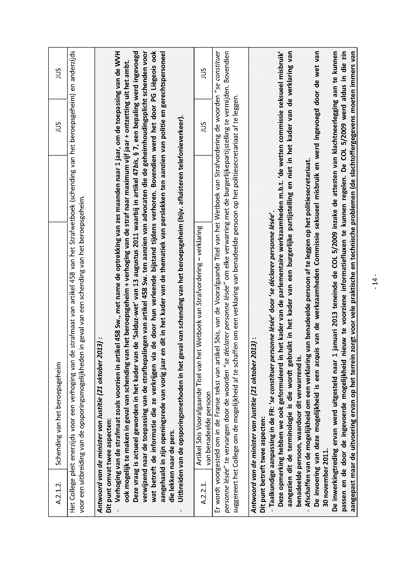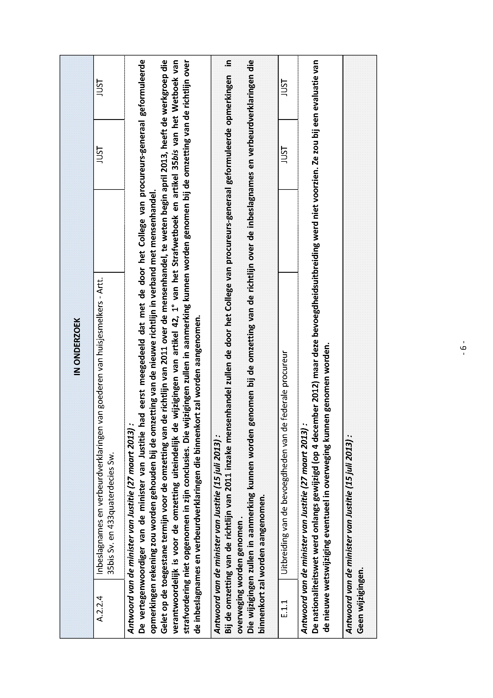 Tijdens de vergadering van 24 februari 2014 gaf de minister van Justitie toelichting bij de punten A.2.3.2, C1.5, E2.1, F.2.1 en E.1.13 uit het verslag 2011-2012. De antwoorden zijn opgenomen in de tabel die als bijlage 5 bij dit verslag gaat.