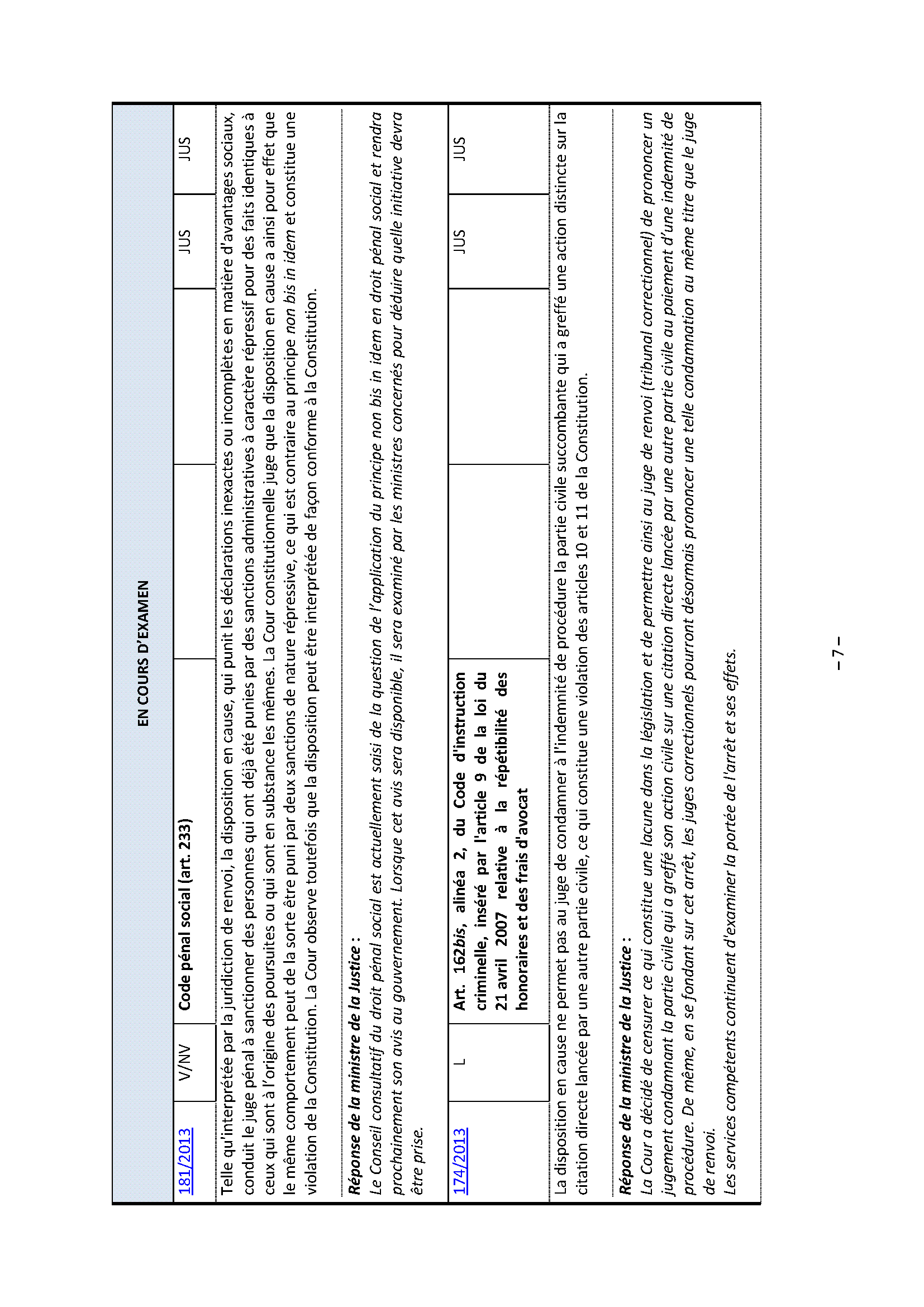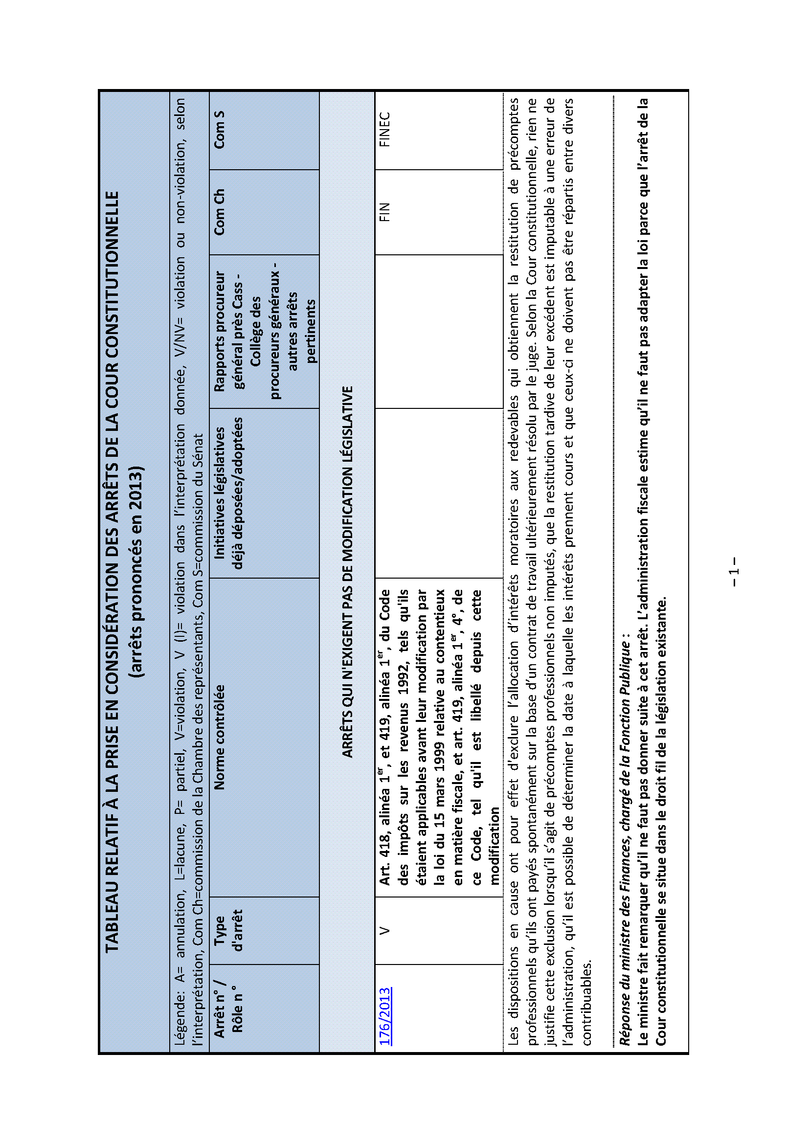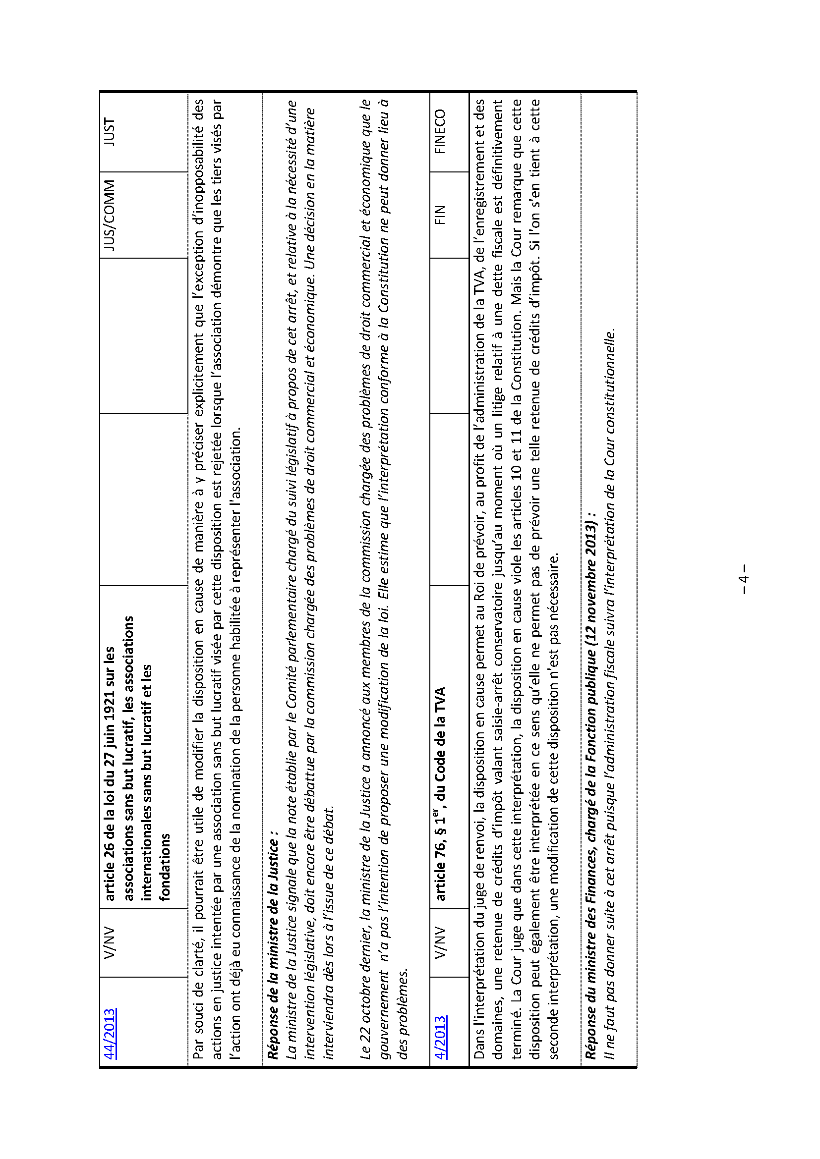 Uit het onderzoek van de antwoorden van de commissies op arresten gewezen in 2013, blijkt dat voor tien arresten de wetgever reeds is opgetreden, dat voor een arrest een wetsvoorstel in Kamer of Senaat werd ingediend, dat voor twee arresten een wetsontwerp wordt voorbereid, dat voor negentien arresten het probleem nog door de regering wordt onderzocht en dat voor zeven arresten geen optreden van de wetgever vereist is.