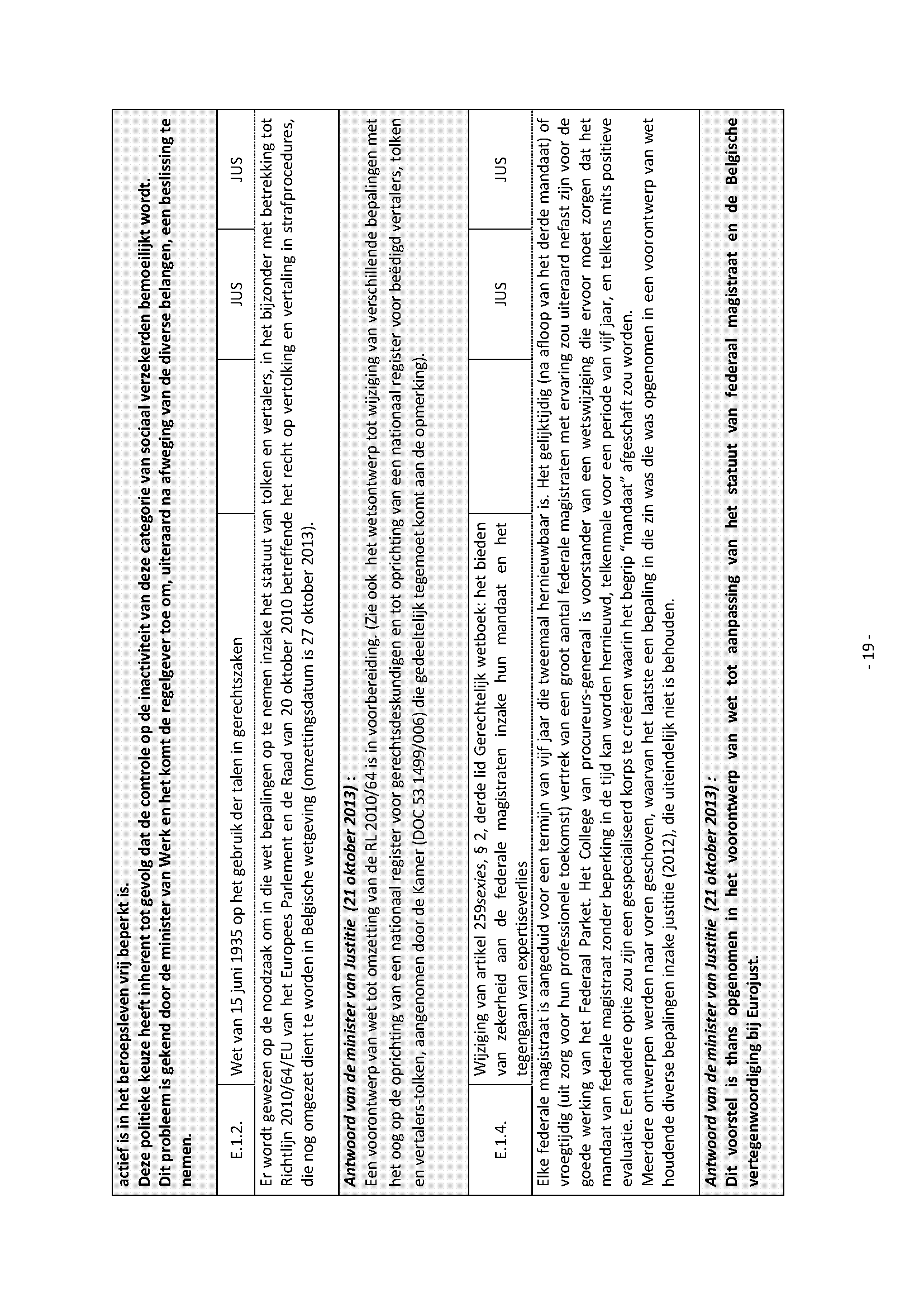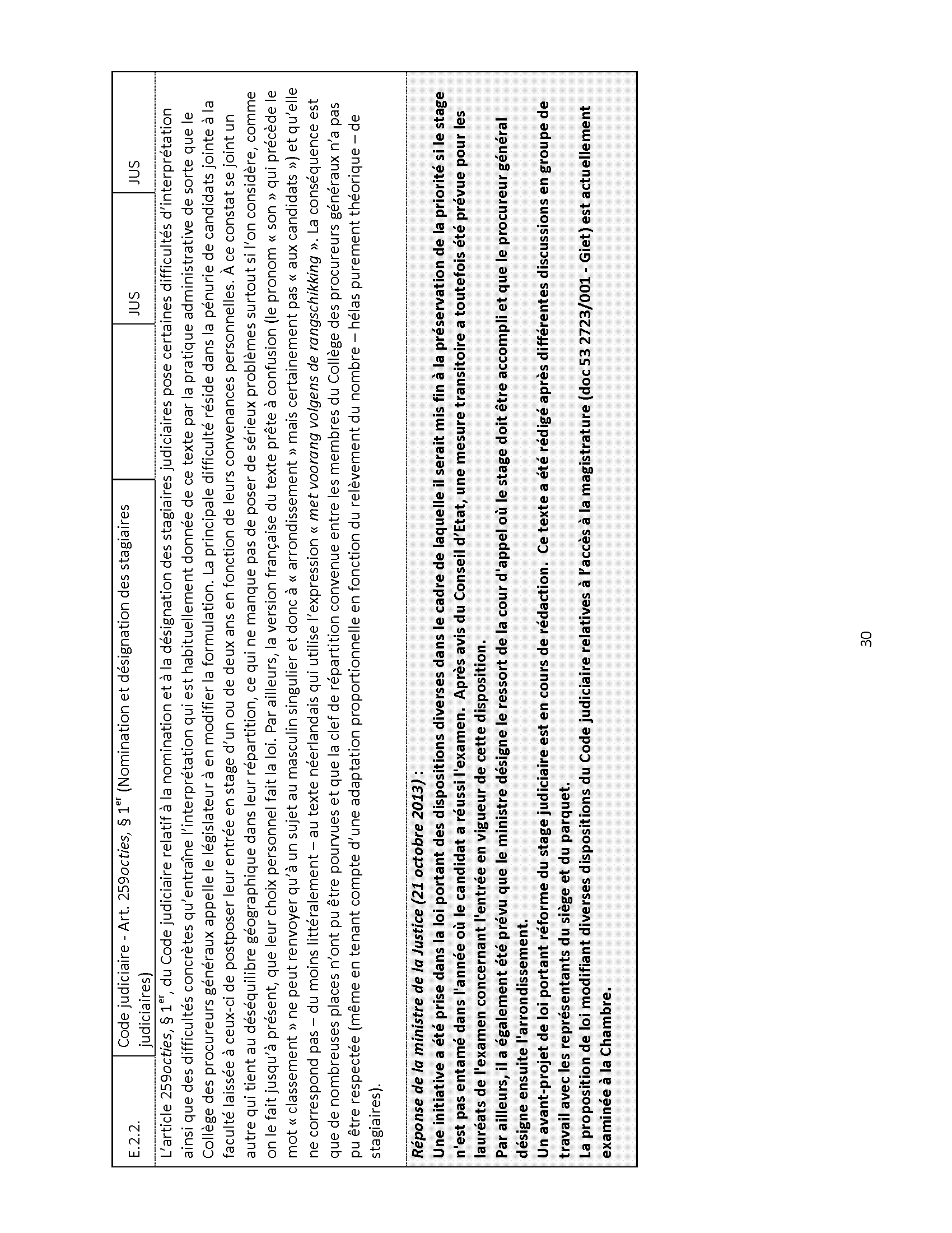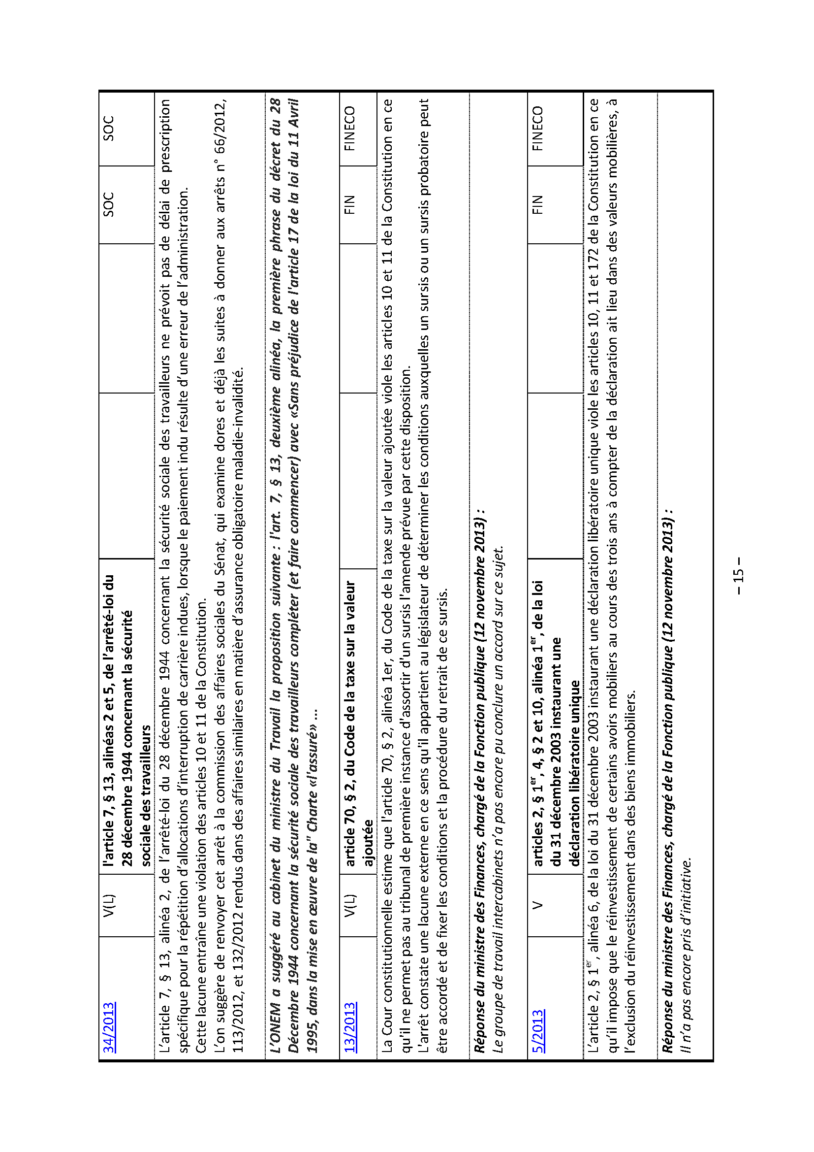 Uit het onderzoek van de antwoorden van de commissies op arresten gewezen in 2013, blijkt dat voor tien arresten de wetgever reeds is opgetreden, dat voor een arrest een wetsvoorstel in Kamer of Senaat werd ingediend, dat voor twee arresten een wetsontwerp wordt voorbereid, dat voor negentien arresten het probleem nog door de regering wordt onderzocht en dat voor zeven arresten geen optreden van de wetgever vereist is.