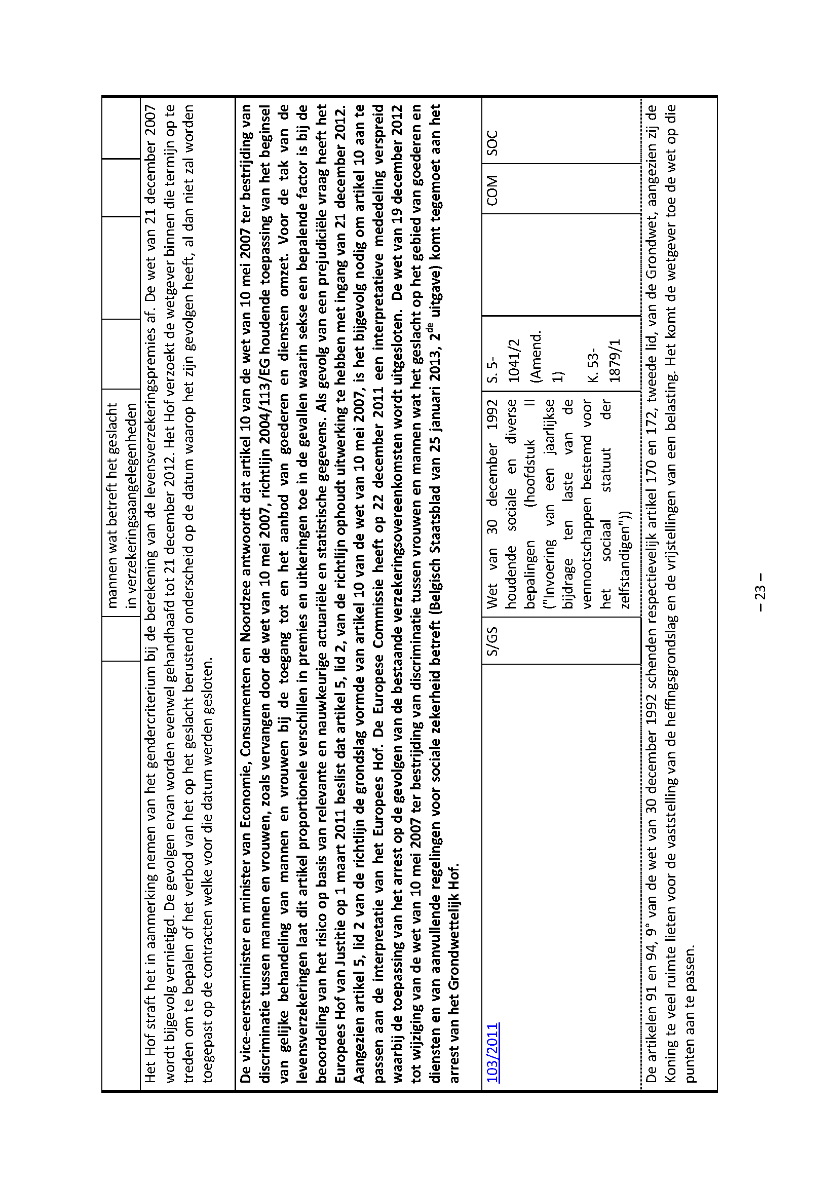 Wat de vijfentwintig arresten van 2011 betreft, bleek dat acht arresten reeds aanleiding hadden gegeven tot een wetswijziging, voor vier arresten een wetsontwerp in voorbereiding of in behandeling was, voor twaalf arresten de problematiek nog door de regering werd onderzocht en voor één arrest geen wetswijziging vereist was.