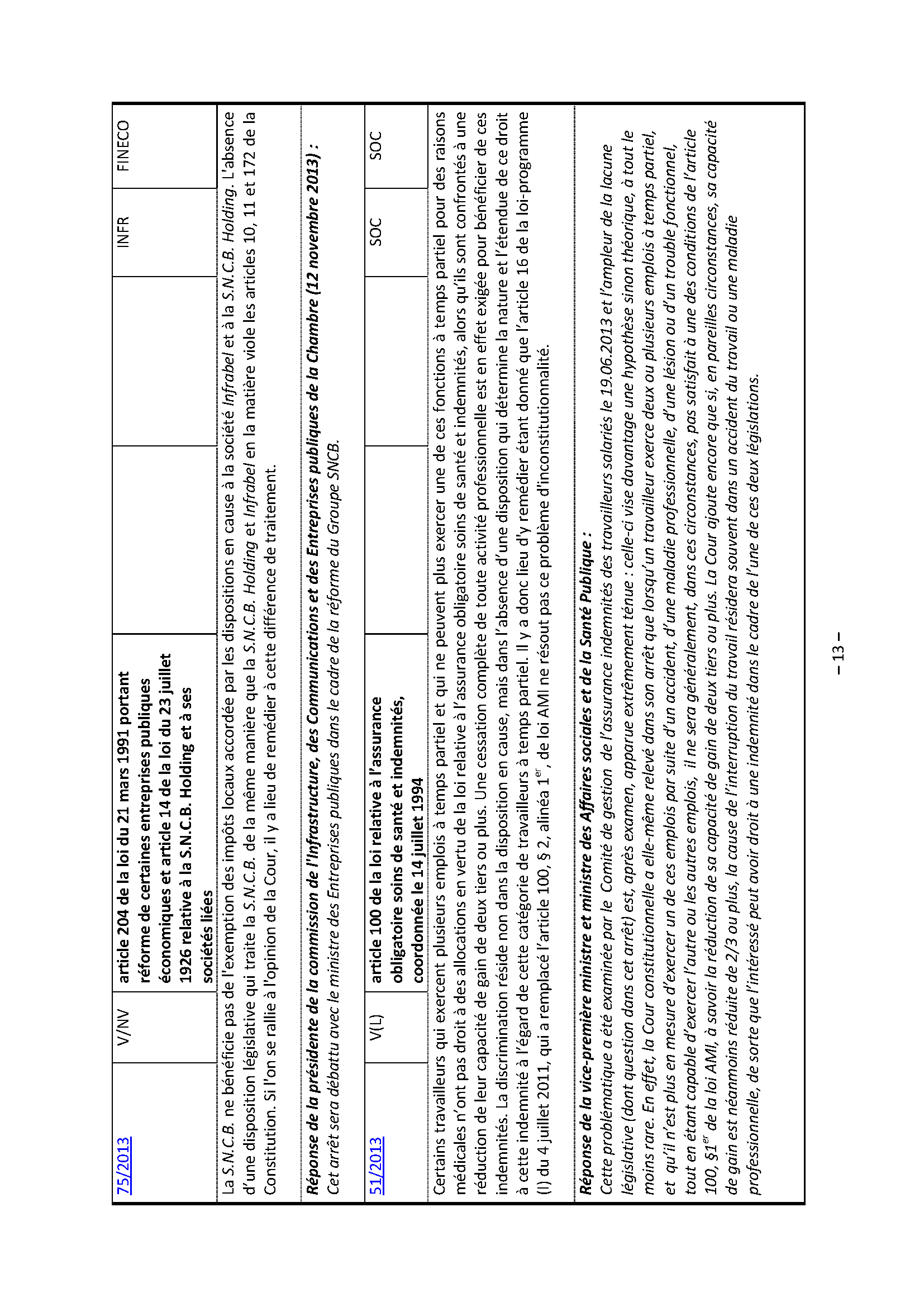 In zijn vergadering van 15 juli 2013 onderzocht het Comité de tussen 1 januari en 30 juni 2013 door het Hof gewezen arresten die een wetgevend initiatief lijken te verantwoorden en deelde het een lijst van twintig arresten mee aan de bevoegde commissies van Kamer en Senaat. Zoals in 2012, werden de commissies verzocht kennis te nemen van deze arresten en binnen een termijn van vier maanden aan het Comité mee te delen :