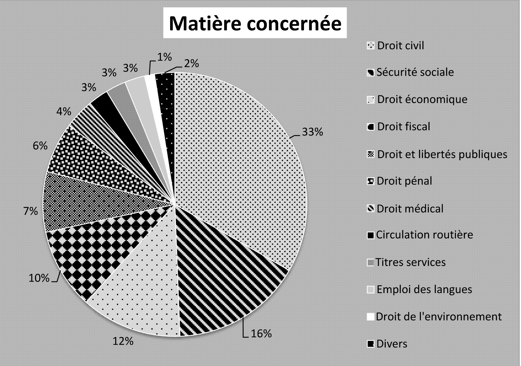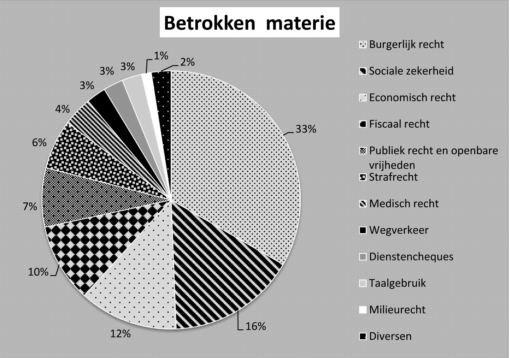 De aard van de verzoekers wordt ook weerspiegeld in de in de verzoekschriften aan bod komende materies : de meeste dossiers hebben immers betrekking op het burgerlijk recht (33 %), het socialezekerheidsrecht (16 %), het economisch recht (12 %) en de fiscaliteit (10 %), aangelegenheden die burgers van nabij in hun dagelijks leven aanbelangen.