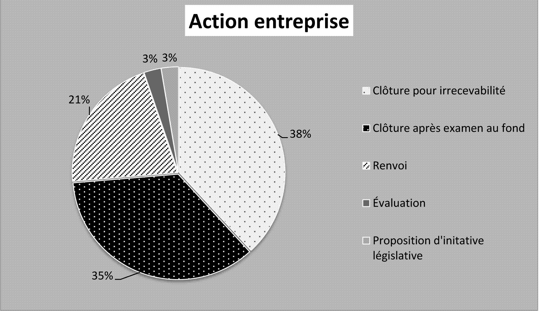 35 % van de dossiers werden gesloten na een onderzoek ten gronde. Anders gesteld : het Comité heeft de bestreden wetsbepalingen geëvalueerd, en geoordeeld dat op grond van de door de verzoeker aangevoerde bezwaren niet kon worden besloten dat een wetswijziging noodzakelijk was.