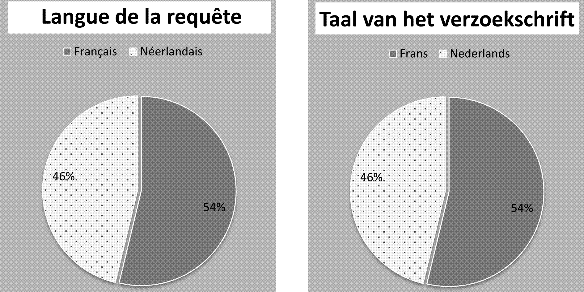 Het volgende diagram geeft de verdeling weer van de verzoekschriften volgens de taal waarin ze werden ingediend. Op 80 verzoekschriften werden er 43 ingediend in het Frans en 37 in het Nederlands. Er werd geen enkel dossier in het Duits ingediend :