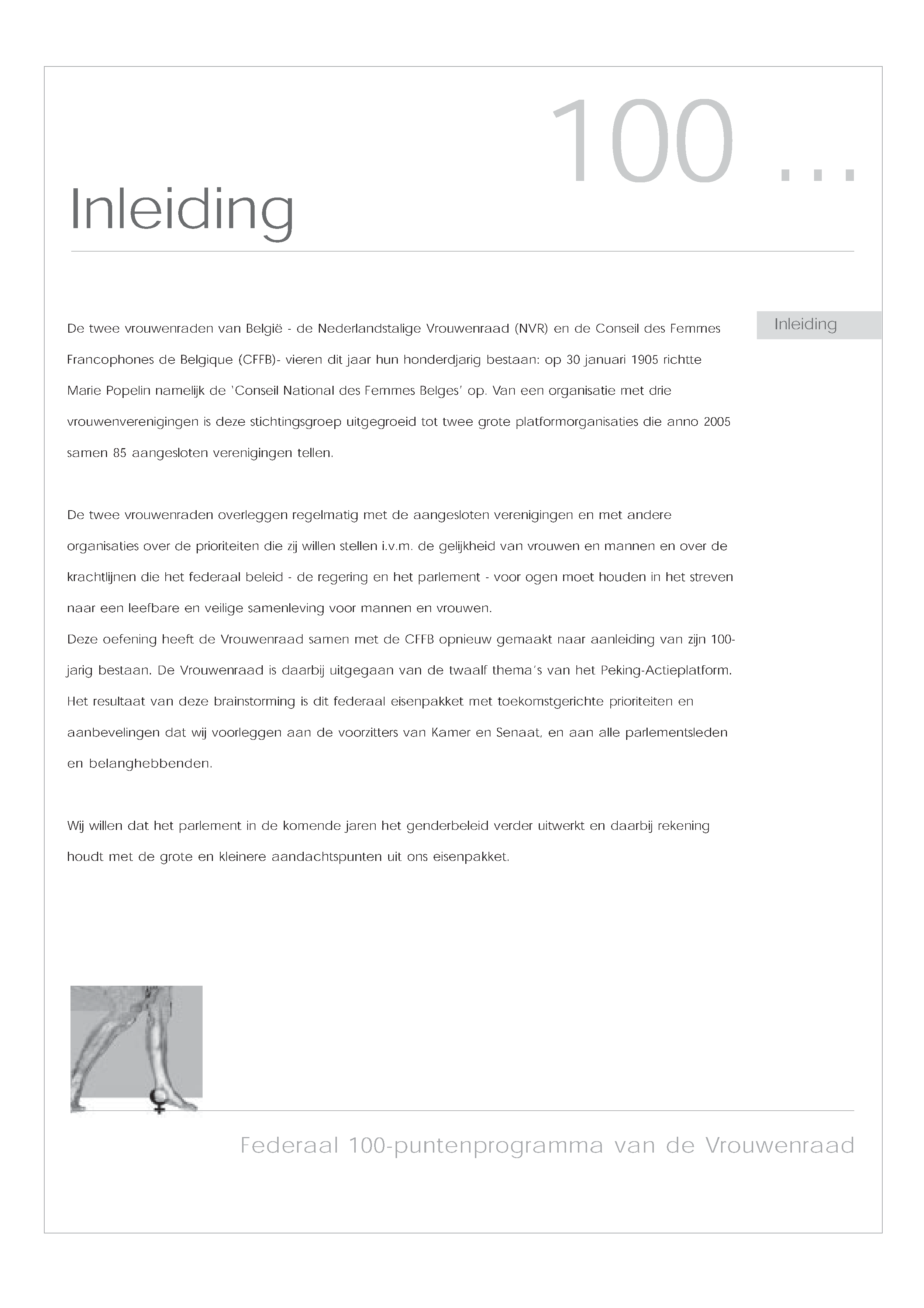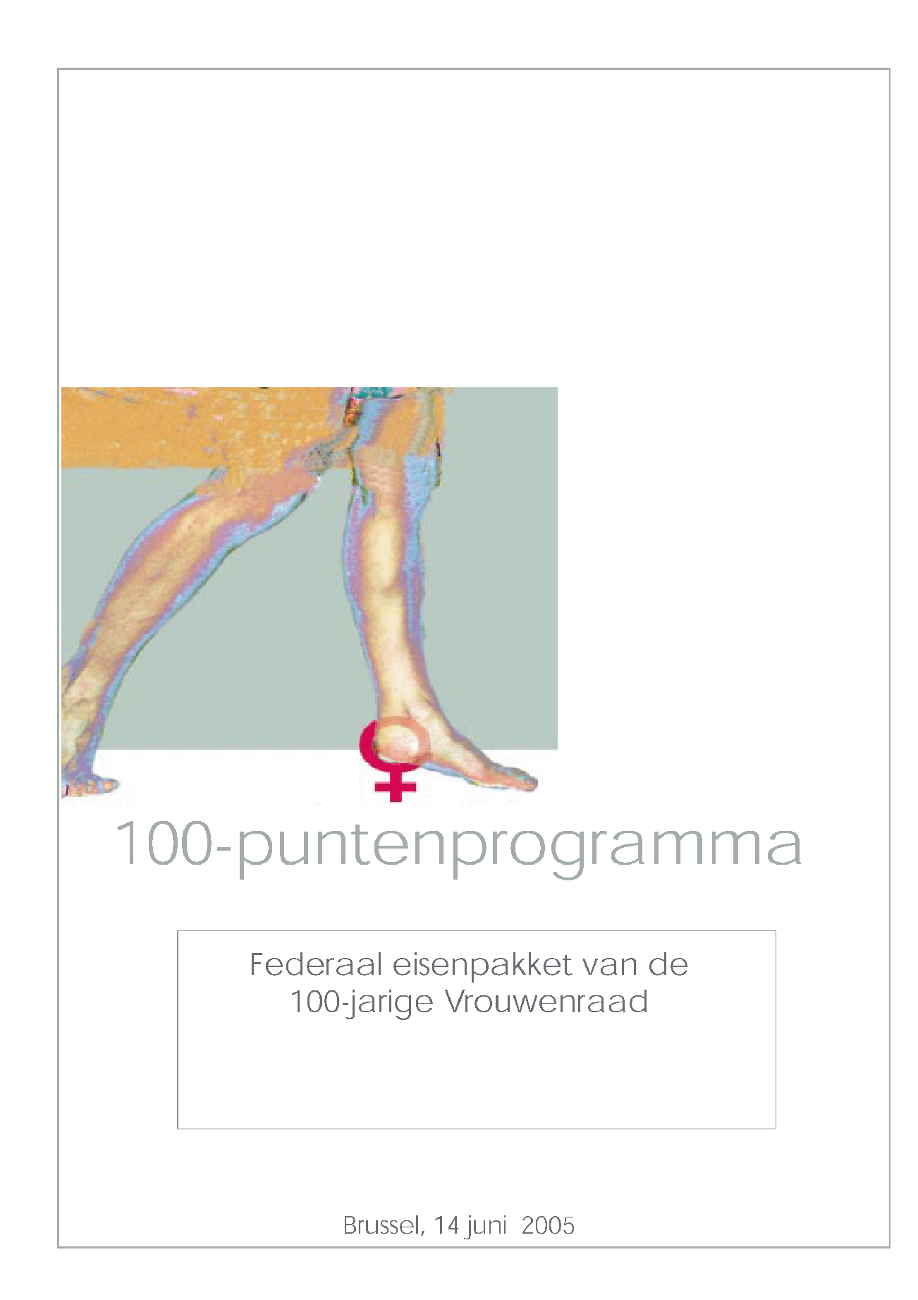 Op 30 januari 1905 richtte Marie Popelin de Conseil national des Femmes Belges op. Van een organisatie met drie vrouwenverenigingen is deze stichtingsgroep uitgegroeid tot twee grote platformorganisaties die anno 2005 samen 85 aangesloten verenigingen tellen. Om het honderdjarig bestaan te vieren werd een sterk gevarieerd eeuwfeestprogramma opgesteld. Alle geplande activiteiten kaderden in één of meerdere van de doelstellingen die de vrouwenraden vooropgesteld hadden voor dit eeuwfeestproject :