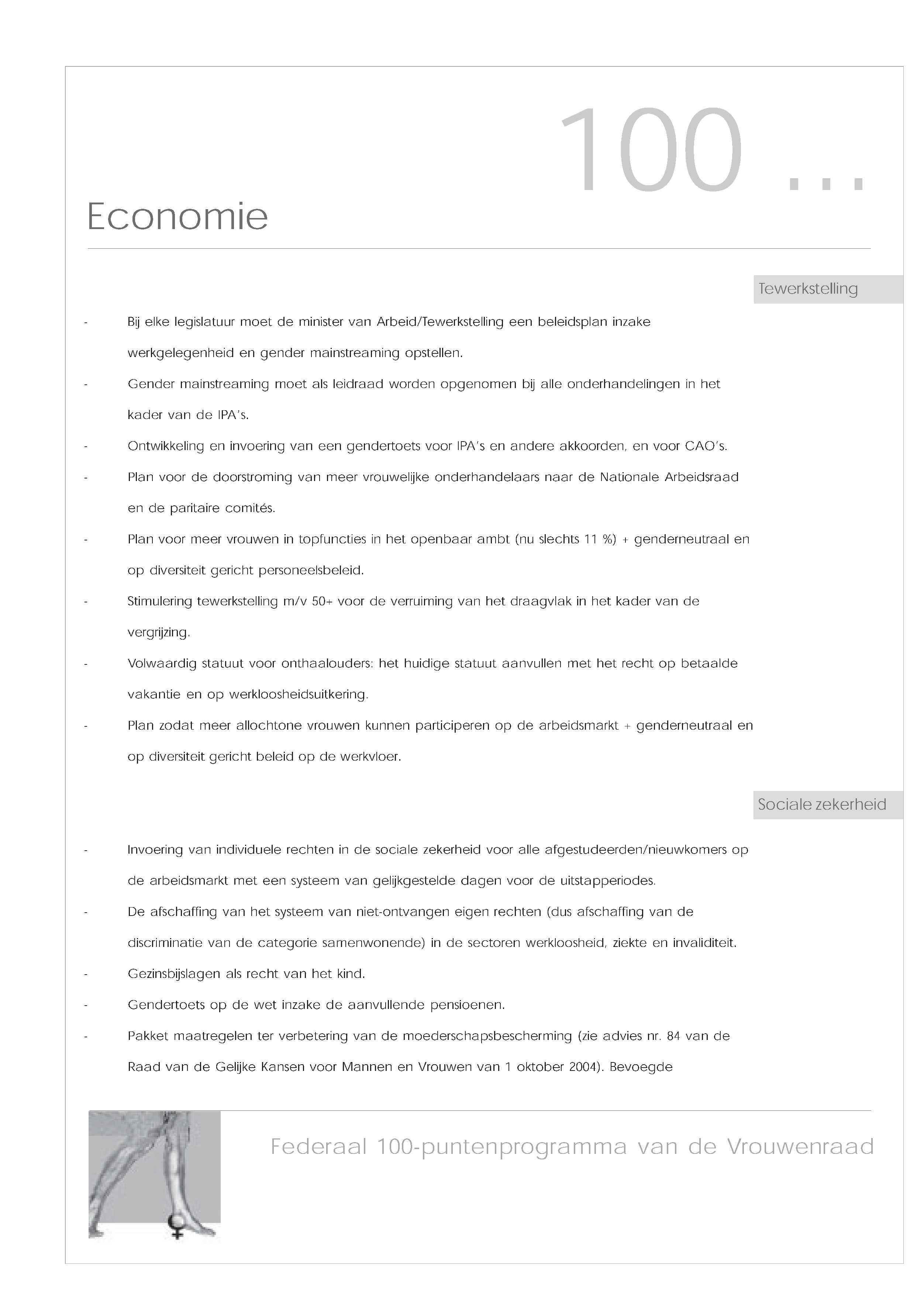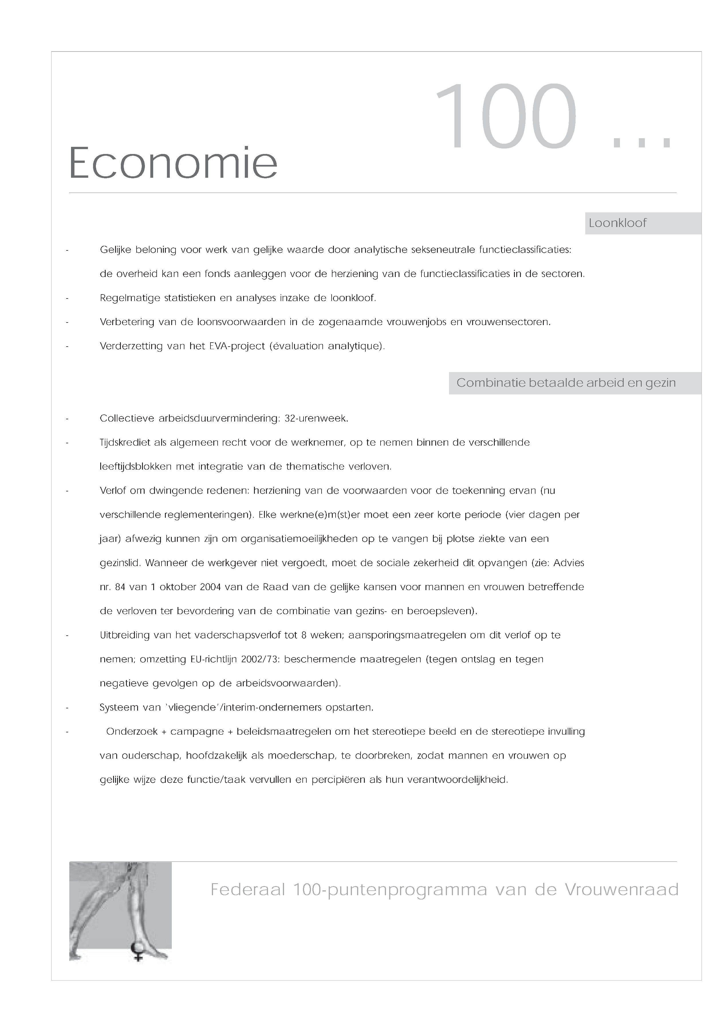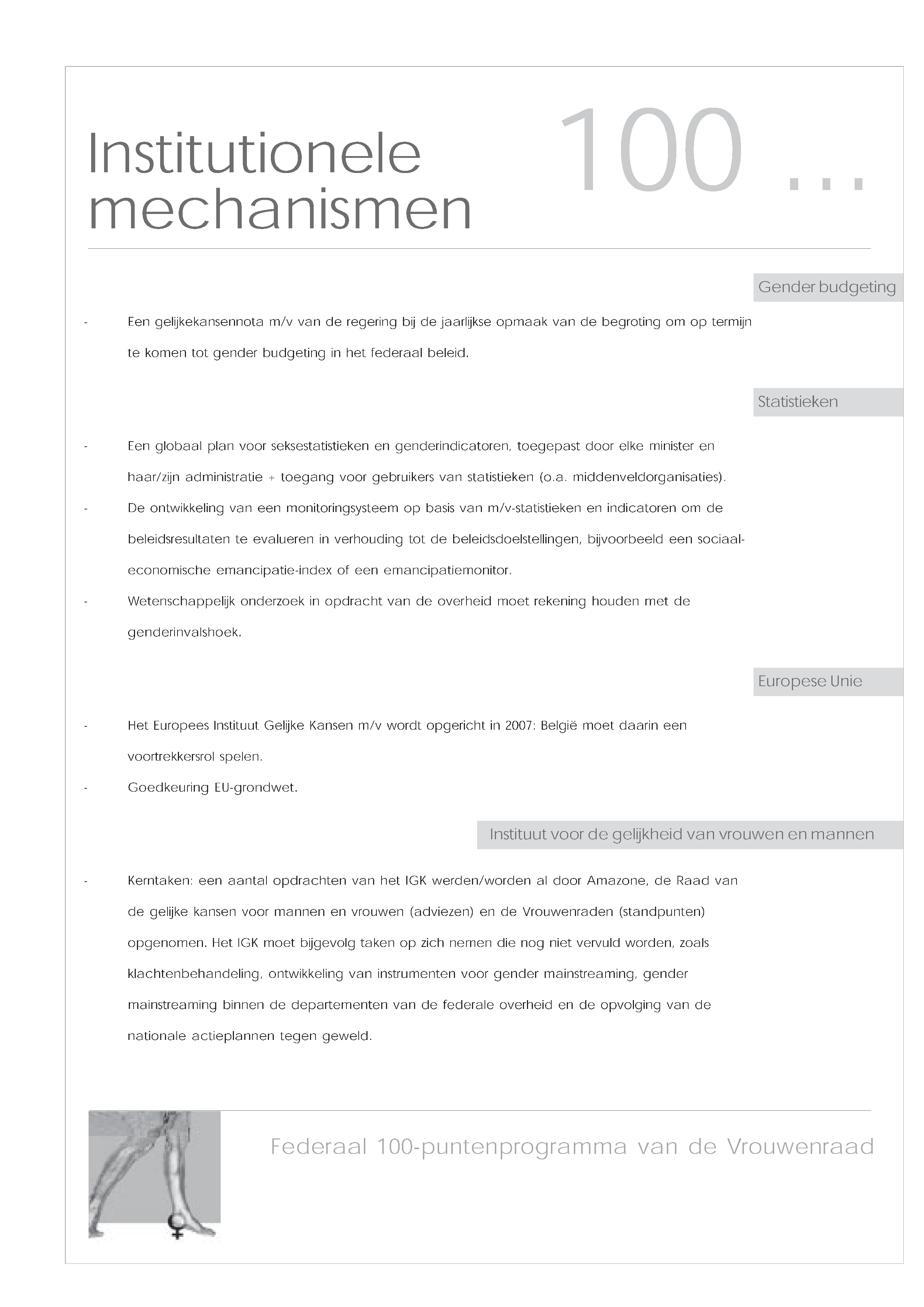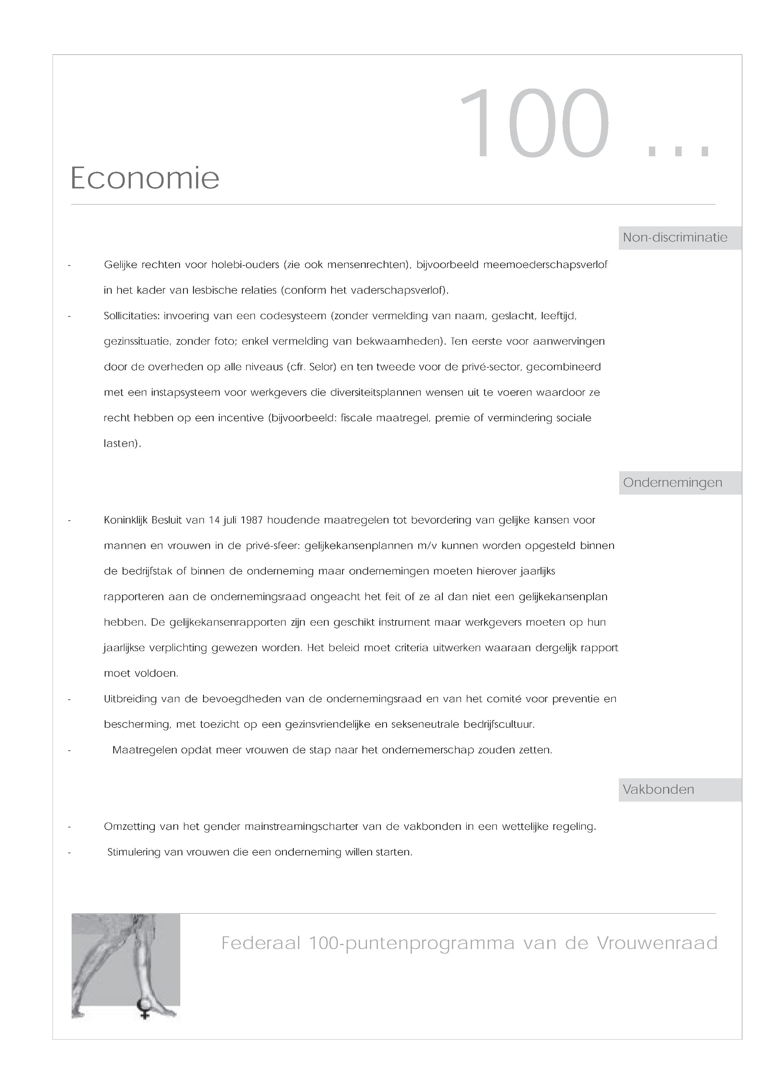 Naar aanleiding van deze viering stelden de vrouwenraden een federaal eisenpakket van honderd punten op. Het adviescomité ziet dit ook als een gelegenheid om van gedachten te wisselen over het federale beleid ter ondersteuning van de vrouwenkoepels en de toekomst van de vrouwenbeweging.