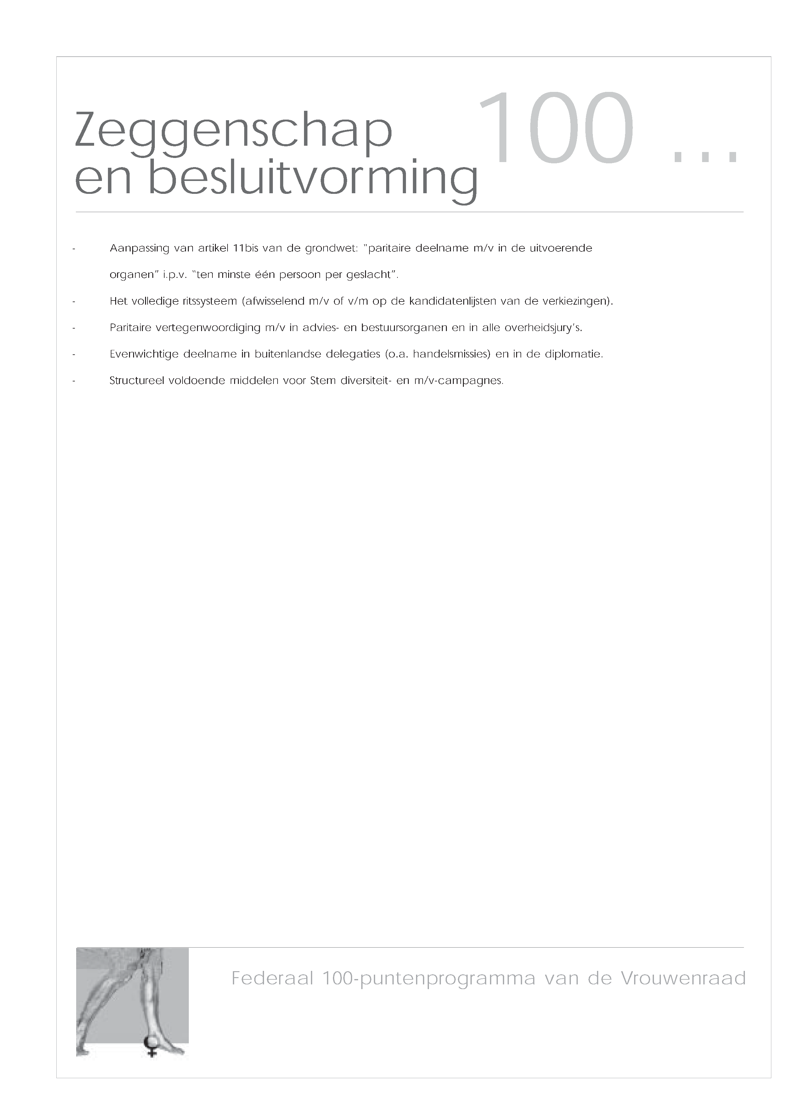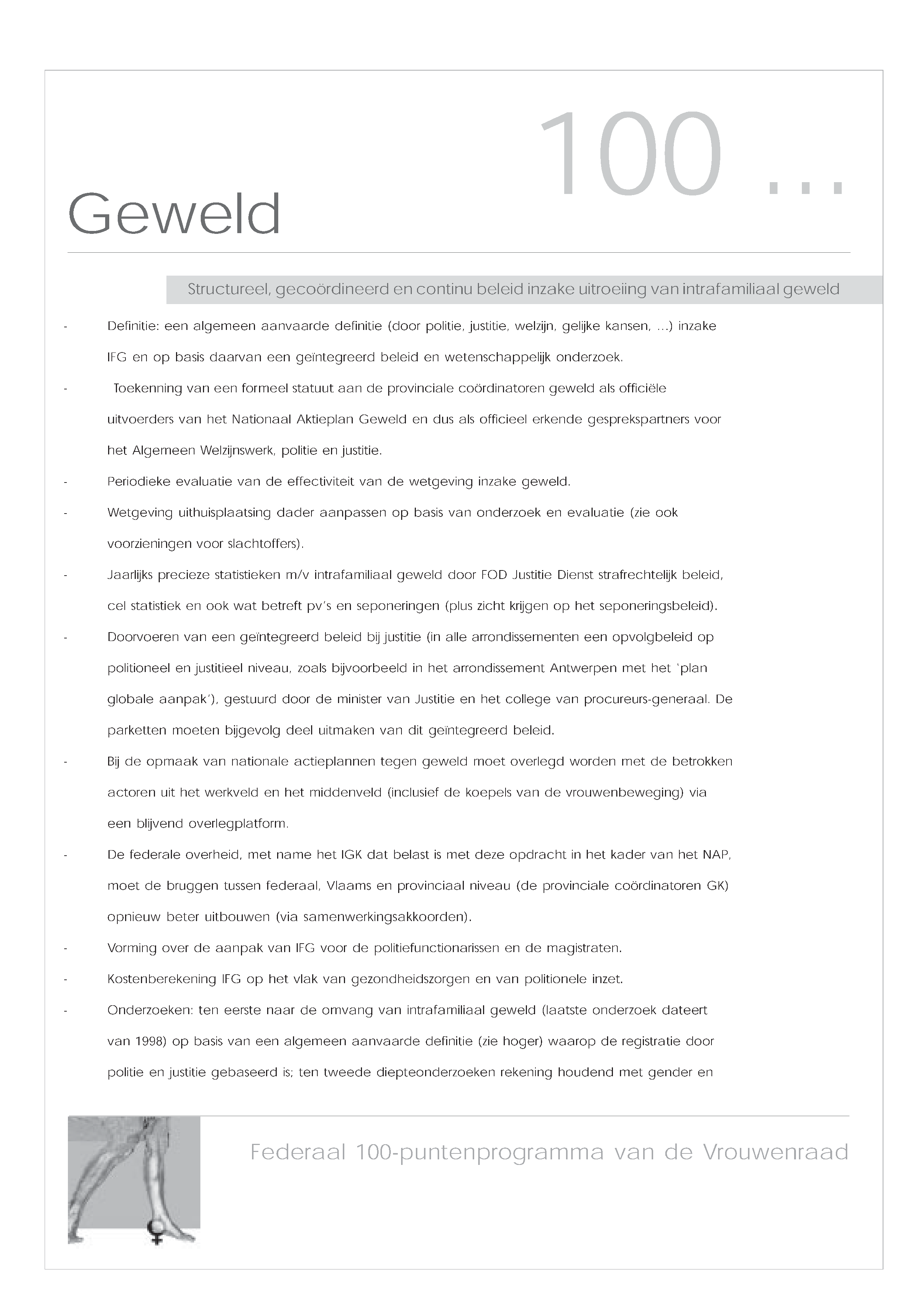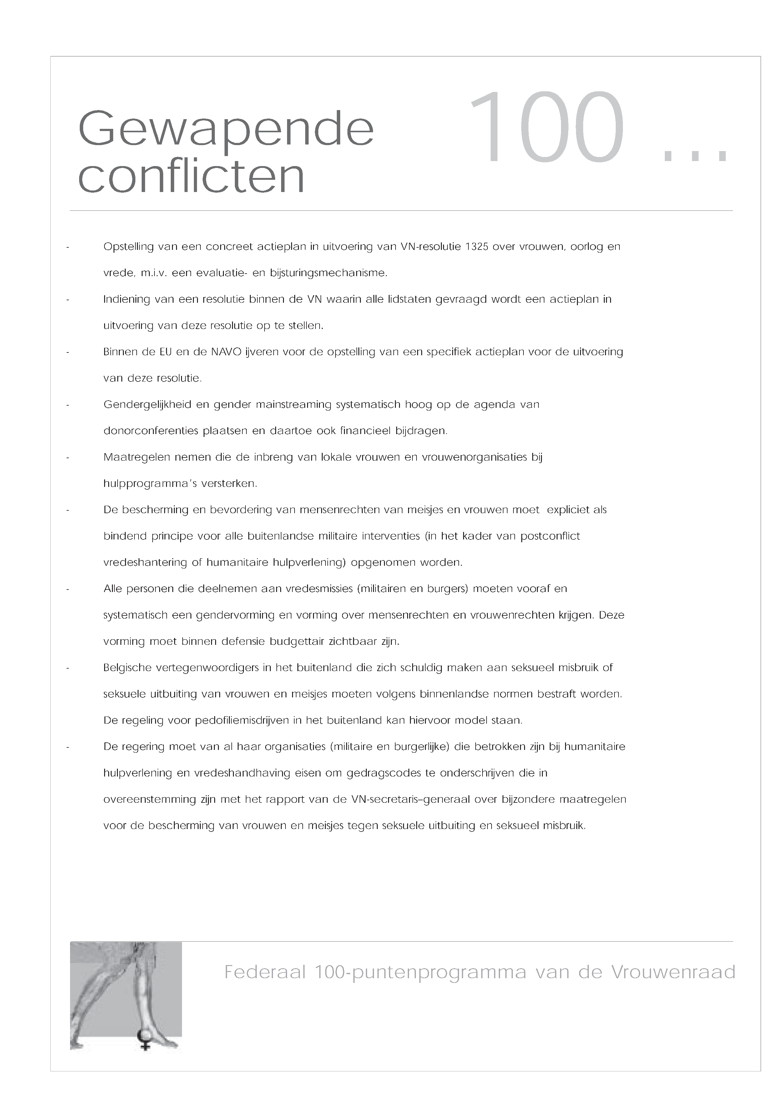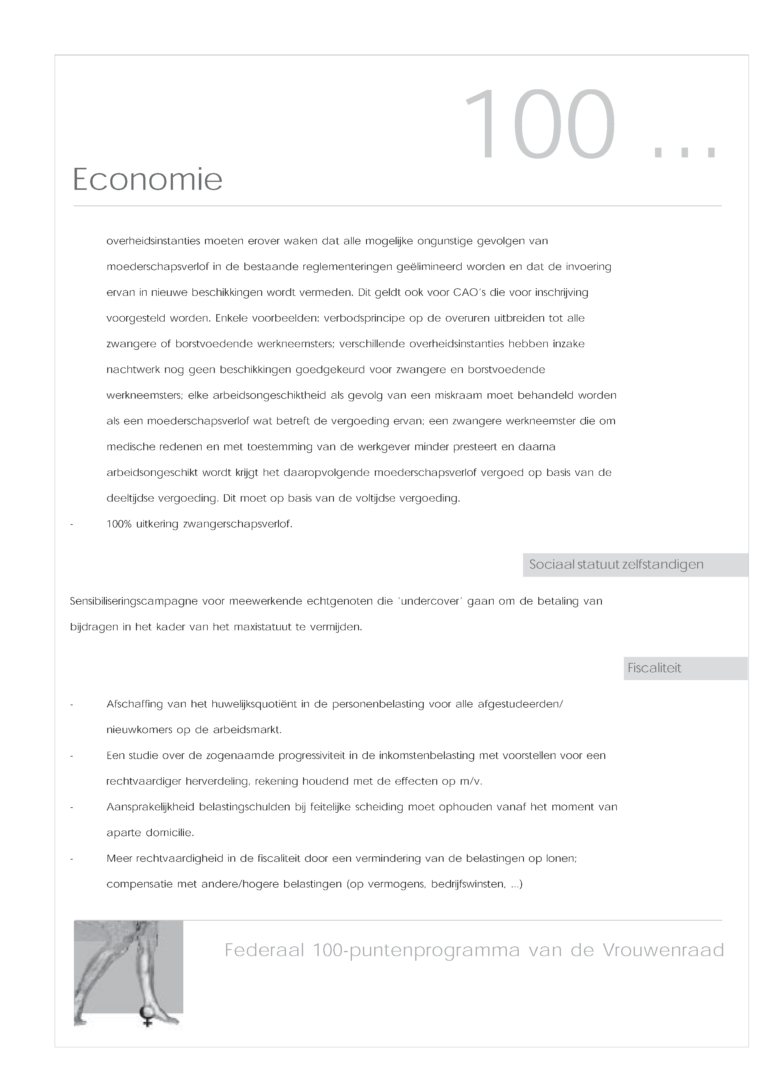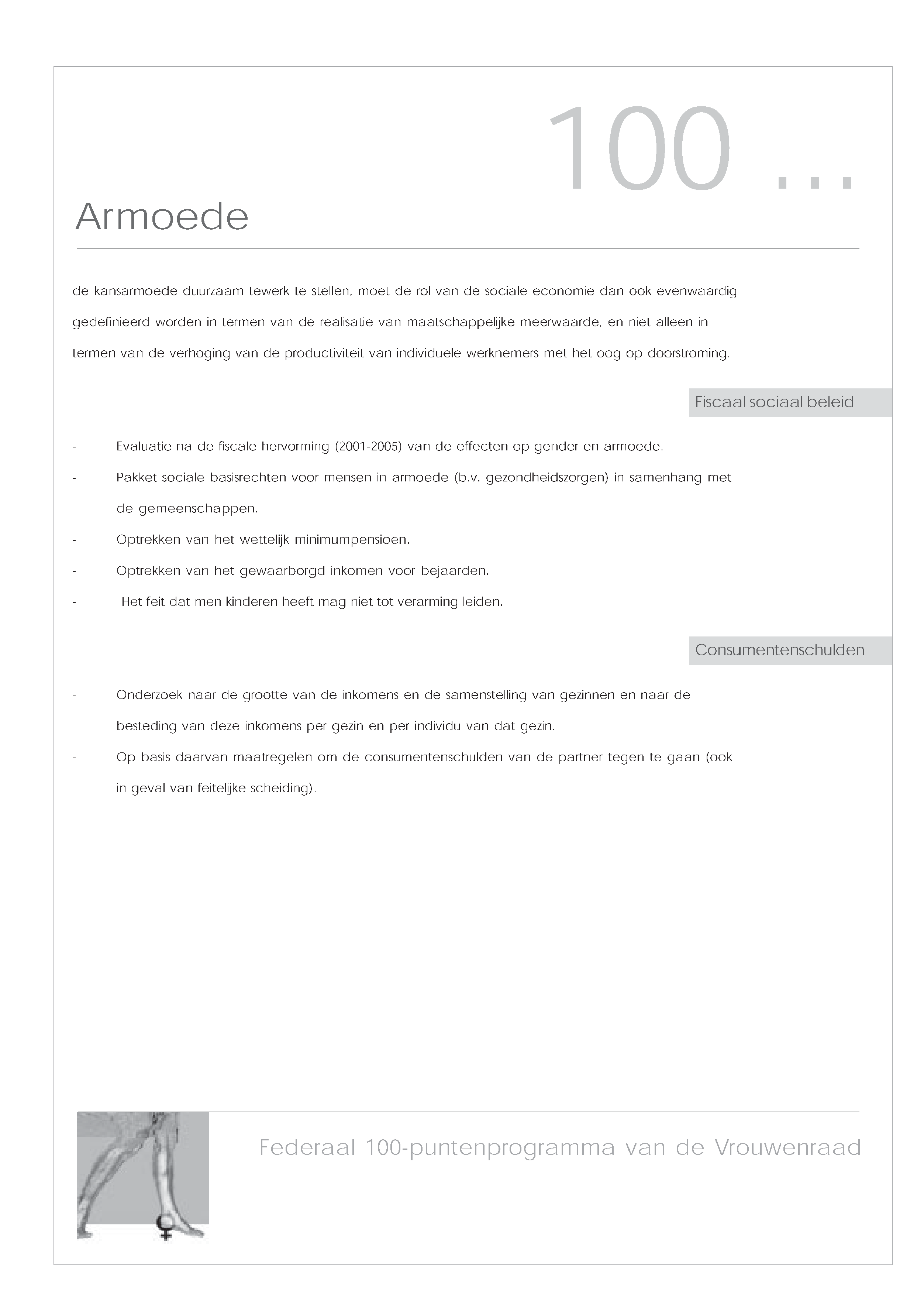 Naar aanleiding van deze viering stelden de vrouwenraden een federaal eisenpakket van honderd punten op. Het adviescomité ziet dit ook als een gelegenheid om van gedachten te wisselen over het federale beleid ter ondersteuning van de vrouwenkoepels en de toekomst van de vrouwenbeweging.