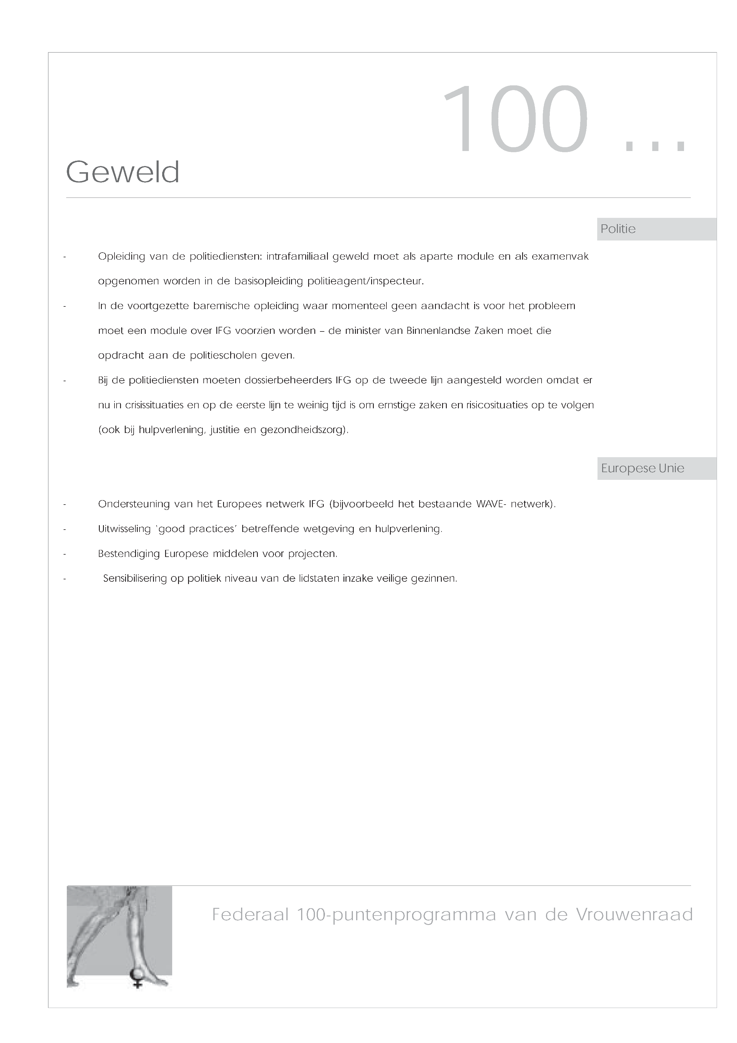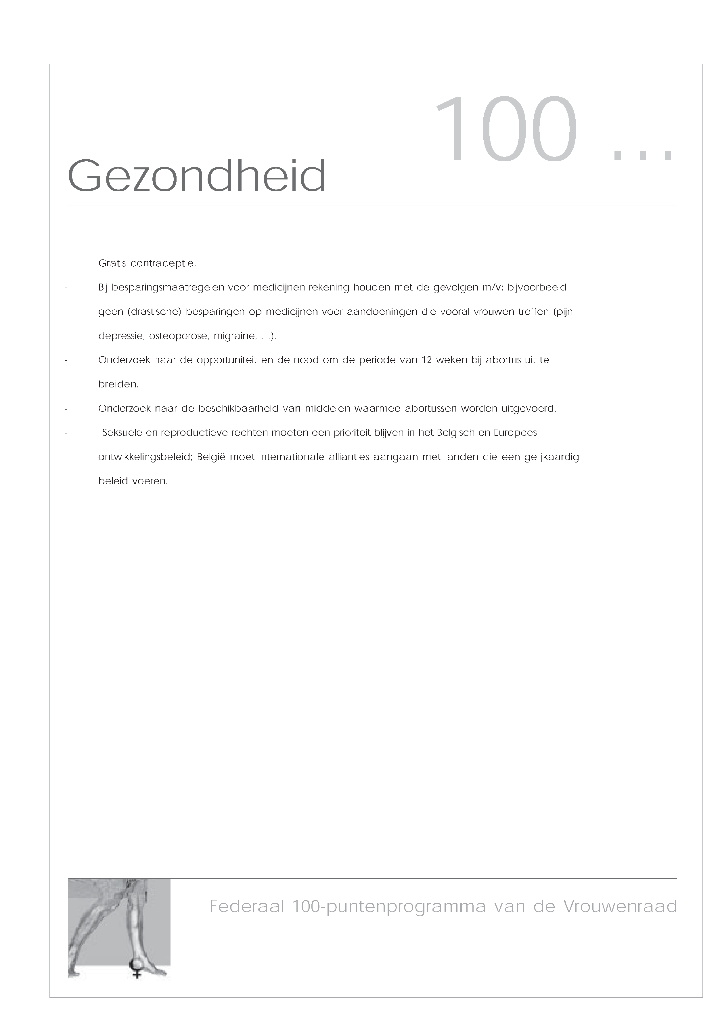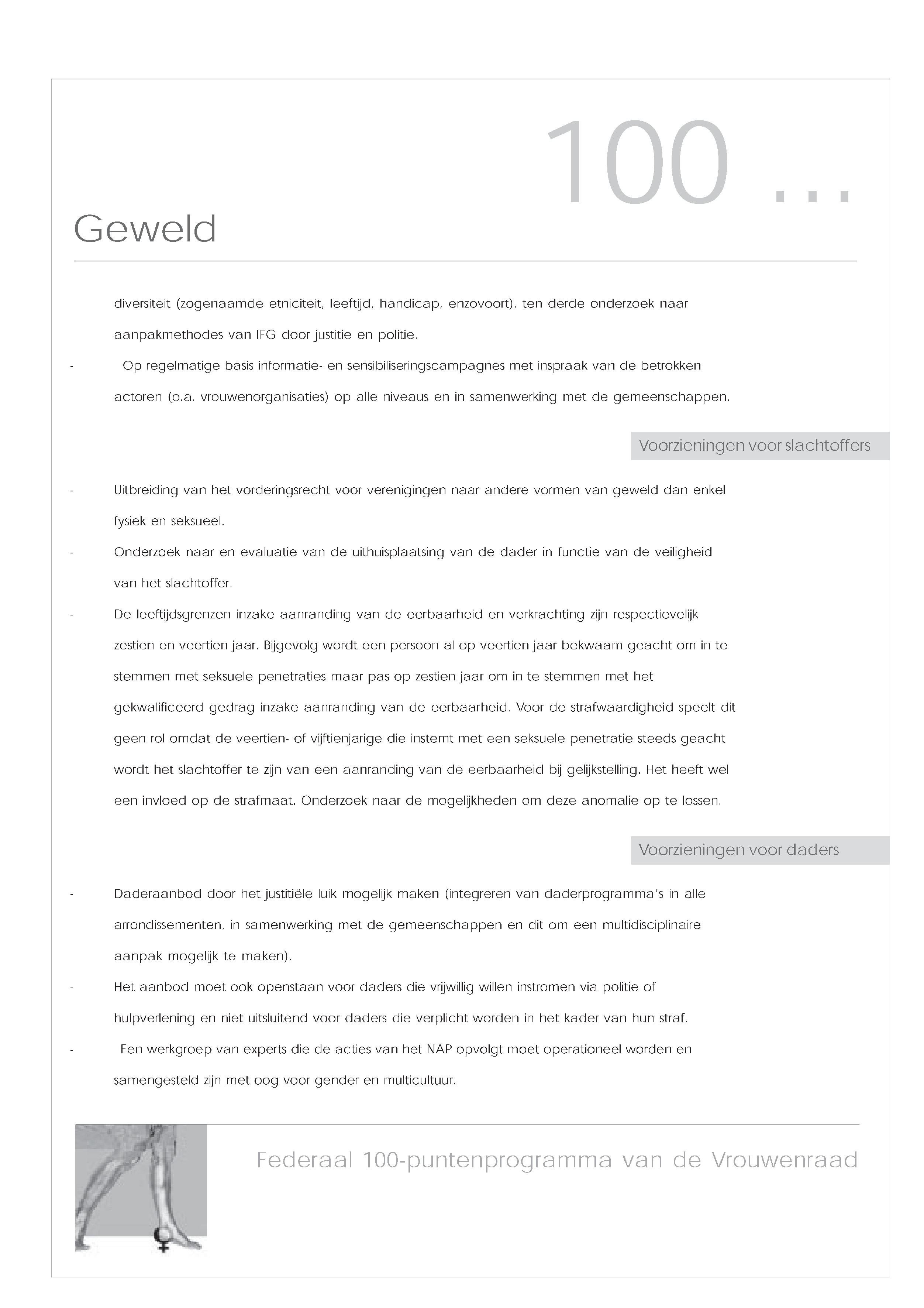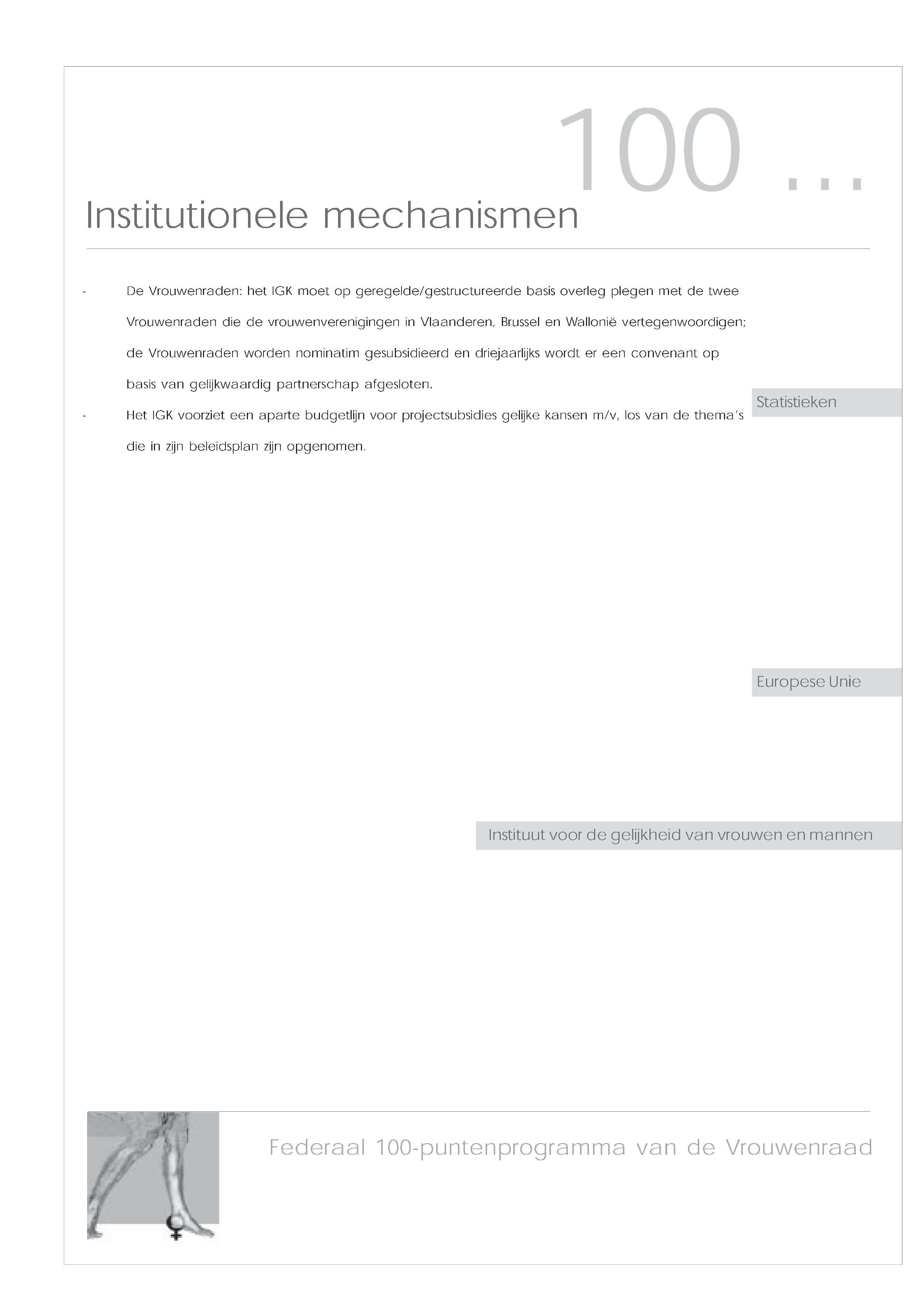 Naar aanleiding van deze viering stelden de vrouwenraden een federaal eisenpakket van honderd punten op. Het adviescomité ziet dit ook als een gelegenheid om van gedachten te wisselen over het federale beleid ter ondersteuning van de vrouwenkoepels en de toekomst van de vrouwenbeweging.