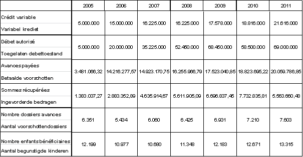 Dans le tableau ci-dessous se trouve un aperçu, par année, du crédit variable, de la position débitrice autorisée, des montants d’avances payées, des sommes récupérées qui ont été attribuées, en tant que recettes, au Fonds alimentaire ainsi que du nombre de dossiers avec avances et du nombre d’enfants bénéficiaires de ces avances.